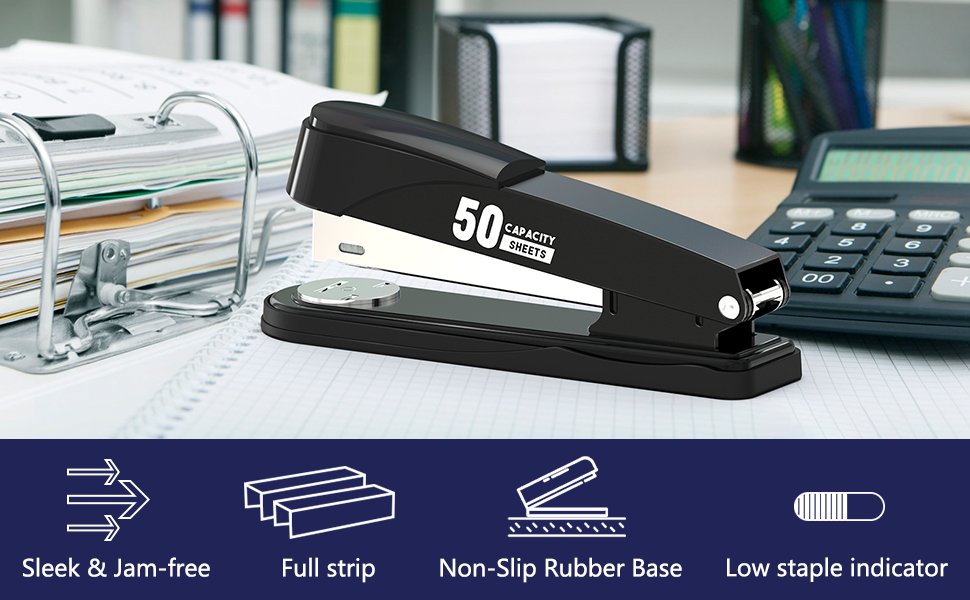 Reviewer: Chris Bland Rating: 5.0 out of 5 stars Title: Nice Stapler Review: Works great. very sturdy. Strong hold. Great color. Reviewer: Jong Chon Rating: 5.0 out of 5 stars Title: Reliable and Sturdy Stapler for Office Use Review: This heavy-duty metal stapler handles up to 50 sheets with ease, making it perfect for both office and classroom tasks. The build quality feels solid and durable, and it comes with 1,750 staples and a handy staple remover, which is a great bonus. I really like the no-jam design—it hasn’t failed me yet, even with thicker stacks of paper. The non-slip base keeps it steady on my desk, adding to its overall ease of use. Its bright red color also adds a fun touch to my workspace while making it easy to spot. The full-strip loading means I don’t have to refill it often, which is super convenient during busy workdays. This stapler has definitely exceeded my expectations in performance and value. Reviewer: Roger D. Wood Rating: 5.0 out of 5 stars Title: Good value for the money!!! Review: A nice stapler. It works great!!! Reviewer: Zoso Rating: 5.0 out of 5 stars Title: Best Stapler Ever Review: I got fed up with the staplers at work and bought my own. I mean, staplers should not be complicated pieces of machinery. Buy the right sized staples, insert, staple paper. Easy peasy. Somehow ALL the staplers at work managed to malfunction. Was it me? Am I dumb? I started to think so. Tried different staples. Tried different paper. Even stole other people’s staplers. I slowlyrealized people were just existing these crappy staplers where you need pliers on your desk as an accessory for said staplers. So I bought this guy and its a little beast! I love it. I bought pink so the guys at work wouldn’t steal it. I know, pink is for everyone, but I work in a blue collar shop so you understand. This thing staples everything without a hitch! Easy to refill, doesn’t get gummed up, heavy enough to be a weapon if you work in a sketchy area like I do. It’ll even do cardstock with no complaint (I tried it, for science). Can’t go wrong with this little guy. Reviewer: Kimberly A AsKew Rating: 5.0 out of 5 stars Title: Good stapler Review: Works just like it says! Reviewer: Trevor Huff Rating: 4.0 out of 5 stars Title: Great Unit, not much grip though Review: Definitely a heavy duty constructed unit, pretty much all solid metal and I haven’t experienced any jams, however there isn’t much of a “non-slip” base or grip on the bottom Reviewer: christa dunlap Rating: 5.0 out of 5 stars Title: Great stapler! Review: I’ve used it as a high school teacher for about 3 months now. Not a single jam and it staples with ease bigger stacks of paper. Love it and would order again. Reviewer: Steve Brockmiller Rating: 5.0 out of 5 stars Title: Very heavy duty. Review: For a heavy duty stapler, this one is designed great and very durable and easy to use. Closing on a house requires alot of different paperwork. I needed something that was light weight and jam resistant. This one , after using it alot to date is a very good buy for the money. Reviewer: Pavel Rating: 5.0 out of 5 stars Title: Review: Cadillac of staplers, staple remover have lock on it too all metal except black parts. Reviewer: Jesús Alejandro Vázquez Guzmán Rating: 5.0 out of 5 stars Title: Review: Se siente resistente pero creo que es muy caro Reviewer: GELB Rating: 4.0 out of 5 stars Title: Review: Agradable al tacto, no se atoran las grapasBuena compra Reviewer: Semble être le mauvais produit Rating: 5.0 out of 5 stars Title: Review: Impressionné Reviewer: Lakhshmi Rating: 5.0 out of 5 stars Title: Review: Strong durable stapler