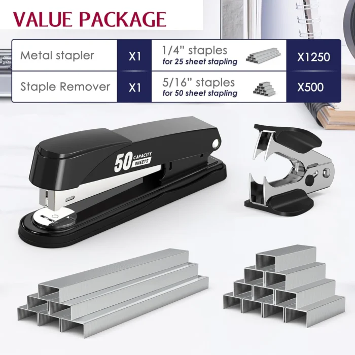Metal Stapler Heavy Duty 50 Sheet Capacity with 1750 Staples and Staple Remover, Full Strip Staplers for Desk, No Jam, Non-Slip for Office & Classroom, Black