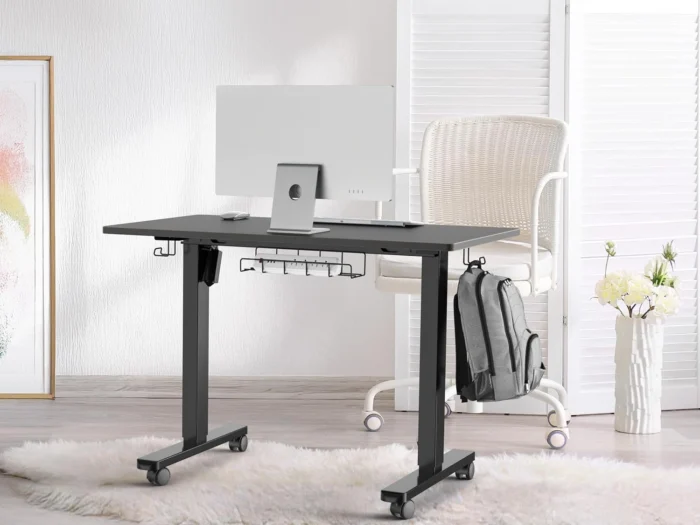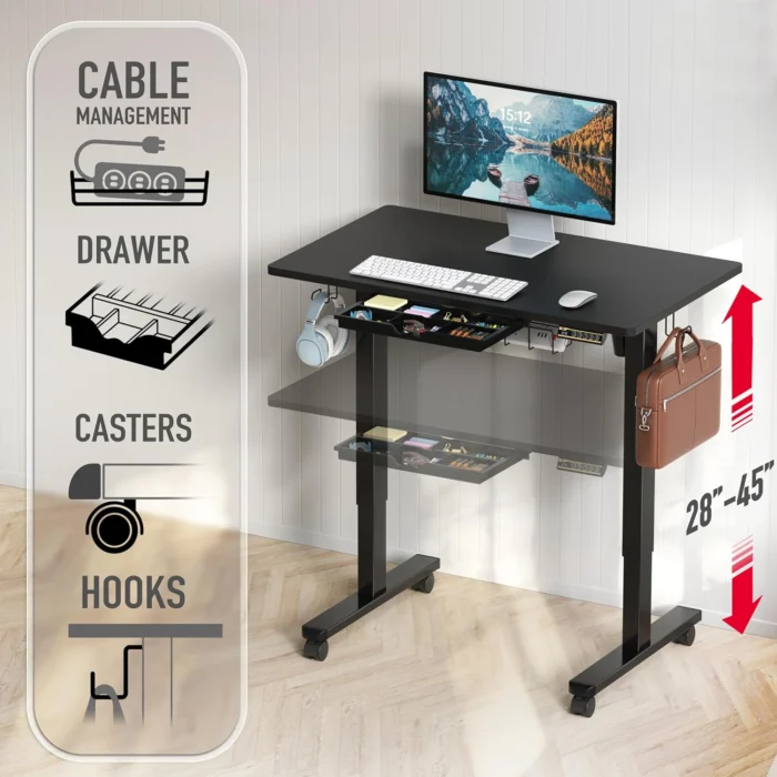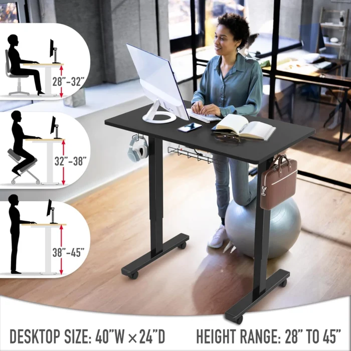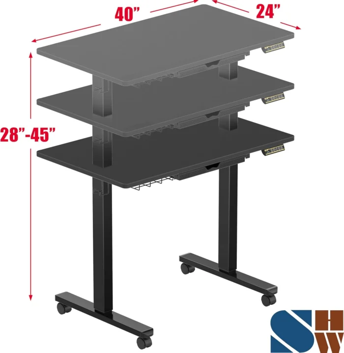 SHW 40-Inch Mobile Electric Height Adjustable Sit to Stand Desk with Drawer, Hanging Hooks and Cable Management, Black
