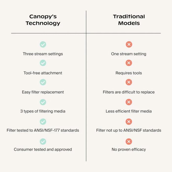 DERMATOLOGIST-RECOMMENDED FOR SUPERIOR HAIR AND SKIN HEALTH: Experience unparalleled improvements in scalp, hair, and skin with our Canopy Filtered Showerhead. 85% of the US has hard water and 64% of all community water systems in the US use added chlorine. Our advanced filtration system combats hard, chlorinated water, reducing symptoms of eczema, psoriasis, and acne, while preventing hair breakage and enhancing the natural vitality of your hair and skin. TRIPLE-ACTION FILTRATION TESTED TO NSF-177 STANDARDS: Our cutting-edge shower head with filters employs granular activated carbon, KDF-55, and calcium sulfite to significantly diminish chlorine, hydrogen sulfide, heavy metals, and more. Protect your hair’s color and texture, and enjoy a shower experience that leaves your skin and hair free from the damaging effects of contaminants. BEST FILTER FOR HARD WATER WITH VISIBLE RESULTS IN 30 DAYS: In a Consumer Perception Study, 96% of participants saw a reduction in product build up, 96% agreed skin felt clearer, 91% felt hair was cleaner, 91% noticed less dryness and breakage, 87% felt less dryness and 87% agreed that their hair felt smoother. Voted Harper’s Bazaar 2023 Beauty Icon, the Canopy Showerhead is a true game changer for your beauty routine. EFFORTLESS, TOOL-FREE INSTALLATION IN MINUTES: Upgrade your shower effortlessly with our simple 3-step installation process, compatible with all standard U.S. showers. Instructions are included with every purchse and takes minutes to install. Use the adjuster on the face of the nozzle to toggle between three water pressure settings: wide, narrow, and dual. THE CANOPY BRAND PROMISE – We are driven by the quality of our products and our commitment to creating reimagined household devices that effortlessly optimize the home for beauty and wellness. Every Showerhead comes with our signature aromas and Felt Diffuser – an experience only found with Canopy. Not only will our showerhead help you improve the health of your scalp, hair and skin; it will help you unwind, relax and destress after a long day. Take the leap and upgrade your shower routine. %$#