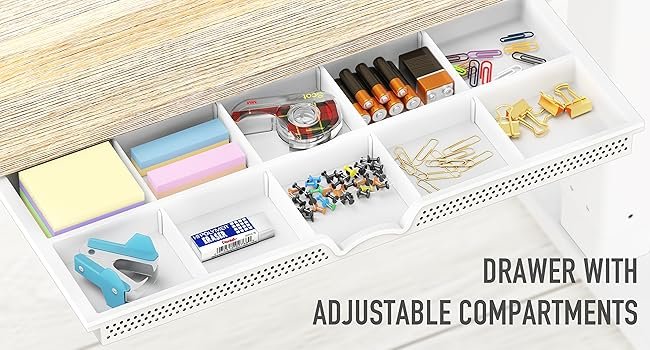 Drawer with Adjustable CompartmentsAdjustable compartments provide a perfect fit for all your stationery and batteries, keeping everything tidy and within reach