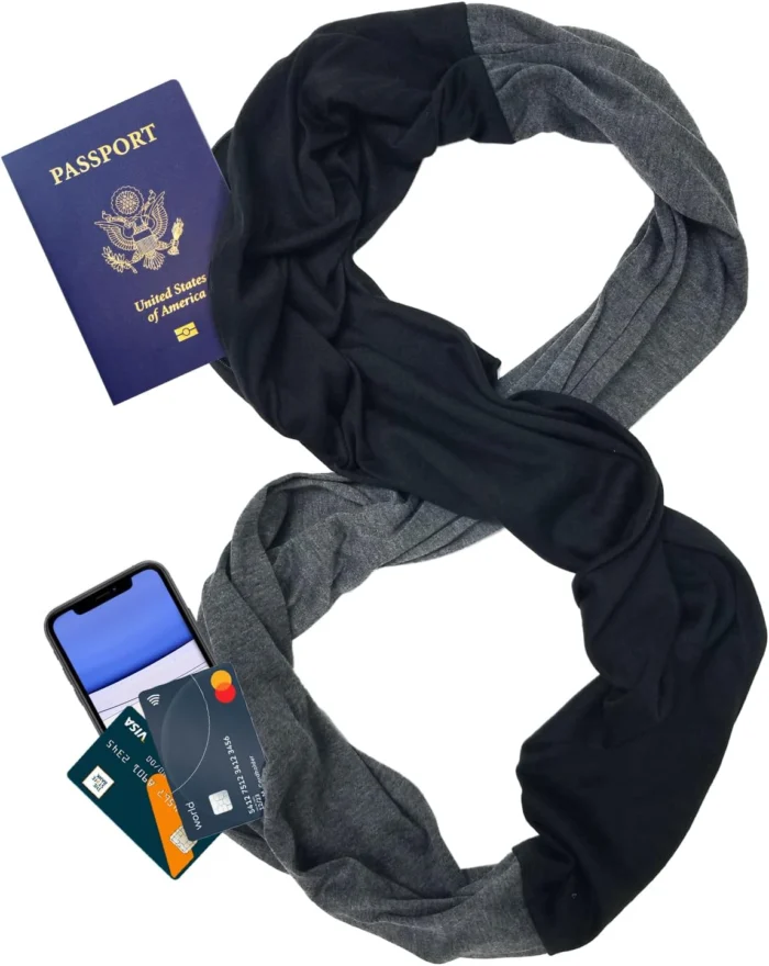 Review: This scarf is a travel game changer! So soft and easy to style. Available in many neutral colors, so only need to pack one. The hidden zip pockets will easily hide my passport and emergency cash and credit card for my next European trip, avoiding the chance that I may lose them. With this mobius style as part of my daily wardrobe, I won’t be removing it, like I would a rectangular scarf.I ordered the black/gray and going to purchase a second one.