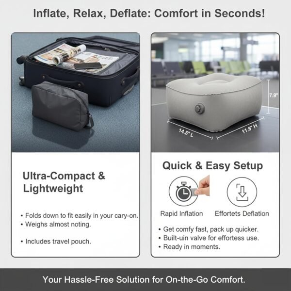 Review: The Inflatable Foot Rest is a simple yet effective travel accessory that brings added comfort to long journeys, whether you’re on a plane, in a car, on a train, or even at home or the office. Its soft, inflatable design offers a cozy place to elevate your feet, helping reduce pressure on ankles and lower legs during extended periods of sitting. This little upgrade can make a big difference when you’re trying to relax, work comfortably, or beat travel fatigue.One of the best features of this foot rest is how easy it is to inflate and adjust. With a few quick breaths, it takes shape and provides stable support at your preferred height. When you’re done, it deflates just as easily and folds up compactly — perfect for tucking into a carry‑on, backpack, or car glove box. Its portability makes it especially handy for frequent travelers or anyone who finds themselves seated for long stretches.The pillow’s soft surface adds to its appeal. Unlike hard bars or rigid supports, this inflatable design feels gentle against your feet and ankles, which can help encourage better circulation and comfort over time. This makes it a thoughtful addition for airplane trips, long car rides, or even days at the office when you want a little extra ergonomic support under your desk.