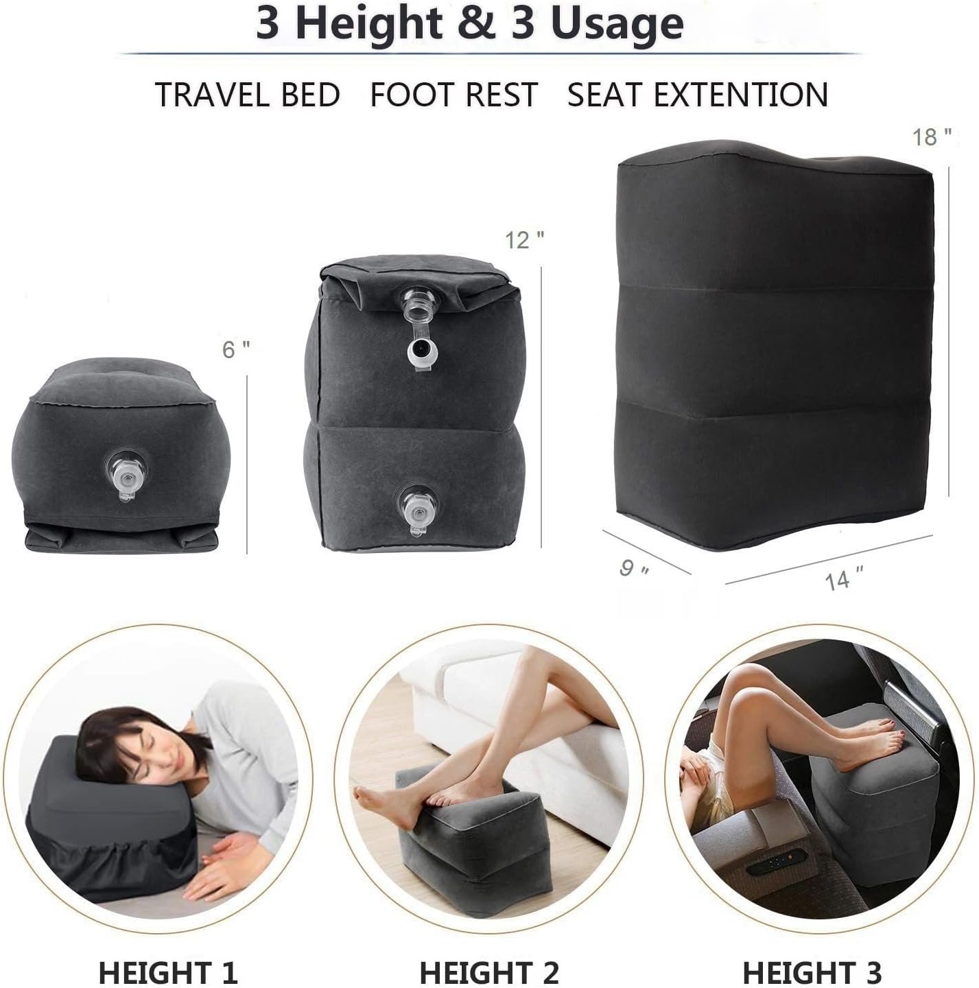 Inflatable Travel Foot Rest Pillow, Adjustable Height Leg Rest Pillow for Cars, Home, Office, Trains, Airplane, Make a Flat Bed for Baby, Kids, Toddlers, Grey, 1 Pack