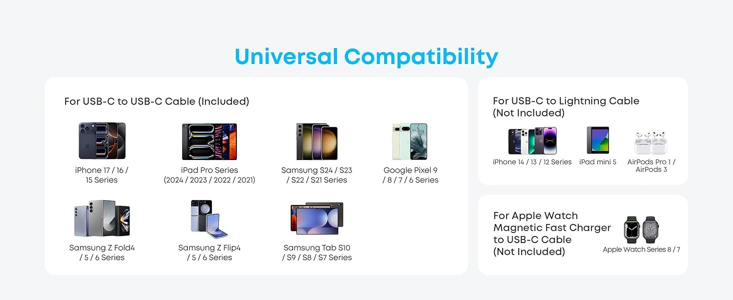 To charge your Apple devices, use the included USB-C to USB-C cable for devices with a USB-C port, like iPads. For devices with a Lightning port, you’ll need a USB-C to Lightning cable or a USB-A to Lightning cable. (Note: Cables not included)