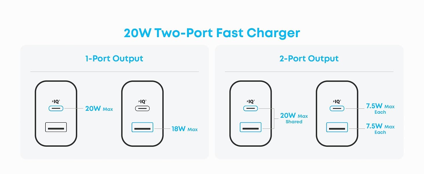1. When only using a single port: USB-C: 5V⎓3A / 9V⎓2.22A / 12V⎓1.67A (20W Max) USB-A: 5V⎓3A / 9V⎓2A / 12V⎓1.5A (18W Max)