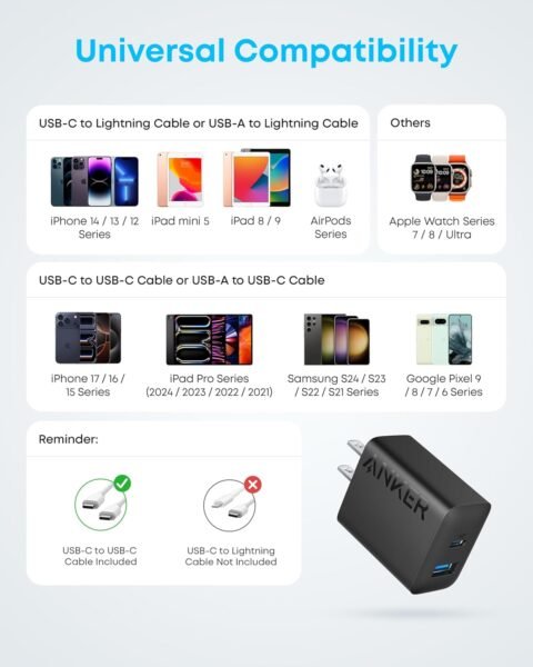 Reviewer: Nicky Goldsmith Rating: 5.0 out of 5 stars Title: These chargers have been an absolute lifesaver! Review: These chargers have been an absolute lifesaver! The powerful 20W output charges my iPhone quickly and reliably every single time. Having two chargers in the pack means I can keep one at home and one in my bag without ever hunting for an outlet or scrambling for a cable. The compact design is perfect for travel and daily use, and it never gets hot even during rapid charging sessions. I appreciate the quality and durability Anker is known for; these feel like they’re built to last far beyond cheaper generic adapters. If you want fast, dependable charging for your iPhone 16 or 17 series without breaking the bank, this 2‑pack is a stellar value. Reviewer: Tony Rating: 5.0 out of 5 stars Title: Fast and consistent charging Review: The Anker 2-Pack 20W Fast USB Charger set has been excellent.They work great with both our iPhones and Pixel phones, delivering fast, consistent charging without overheating or connection issues. I’ve used Anker products for years, and they continue to make quality gear I trust.Each wall plug includes both a USB-A and USB-C port, which is incredibly convenient. Being able to charge two devices at once from a single outlet is especially helpful in shared spaces or while traveling.Build quality feels solid, the cables are dependable, and everything just works the way it should. If you’re looking for reliable fast chargers from a brand with a strong reputation, this 2-pack is an easy recommendation. Reviewer: Benjamin Butters Rating: 5.0 out of 5 stars Title: Fast, Reliable Charging You Can Trust Review: The Anker 20W USB-C Charger 2-Pack is exactly what I want in everyday charging gear — fast, compact, and dependable. Both blocks deliver consistent rapid charging for my iPhone without overheating, and the build quality feels solid and premium.I love getting two chargers in one pack for home and travel, and their small size fits easily in a bag without blocking other outlets. Setup is plug-and-play, and performance has been flawless so far.Reliable, well-engineered essentials like this are what I truly appreciate evaluating and recommending. A smart buy for anyone who wants worry-free fast charging. Reviewer: Kendall Paris Rating: 5.0 out of 5 stars Title: Love anker chargers! Review: Both works fast and good! Works fine with my iPad 10.Charging capacity : speedy 9.5/10Weight, size & sturdiness : Light and 10/10 Reviewer: Amazon Customer Rating: 4.0 out of 5 stars Title: Good quality Review: Works well on Samsung Z Flip 3 and other Samsung phone I have here.Well built, large cable and you get two (chargers and cables) for a fair price.Only detail: even that each charger have two USB port outputs, only works one at a time, so you can’t charge two devices at the same time with one charger. Reviewer: Angela Rating: 5.0 out of 5 stars Title: Very good charger! Review: As the other reviews said , they come with two and charge as fast as the original Apple product. They are cheaper, cords are longer, pretty color, and can charge two gens of Apple products. Awesome! Reviewer: Amazon Customer Rating: 5.0 out of 5 stars Title: Small but Mighty – Perfect Everyday Fast Charger Review: These Anker 20W dual-port chargers have quickly become my go-to for home and travel. They’re compact, powerful, and incredibly reliable — exactly what you want from a charging setup.The 20W fast charging is no joke. My phone powers up noticeably faster compared to my old standard chargers, which is a lifesaver when I’m in a rush. It works great with both iPhone and Samsung devices in our house, so it’s nice not having to swap bricks around.One of my favorite features is the dual ports. Being able to charge two devices at the same time without slowing everything down is super convenient — especially overnight or when sharing an outlet at the airport. The combo of USB-C and USB-A makes it versatile for newer and older cables.Size-wise, these are perfect for travel. They’re small, lightweight, and don’t block other outlets on a power strip. Easy to toss in a bag and forget about until you need them.As always with Anker, the build quality feels solid, and I appreciate the built-in safety protections for temperature and overvoltage. It gives peace of mind when charging more expensive devices.The bundle is a great value too — two 5 ft USB-C to USB-C cables included plus an 18-month warranty and responsive customer service. Hard to beat.If you want a dependable, fast, and portable charger that can handle two devices at once, this is an easy 5-star buy. Reviewer: Simon Rating: 5.0 out of 5 stars Title: Fast, Reliable, and Great Value – Anker Delivers Again Review: I’ve been using this Anker 20W USB-C Fast Charger 2-Pack with the included cables for a few weeks now, and it’s been an excellent upgrade from generic chargers.✅ Pros:• True fast charging: It charges my iPhone 15 Pro noticeably faster than standard 5W or 12W chargers.• Excellent build quality: Both the charger blocks and cables feel premium, solid, and durable.• Compact and travel-friendly: Small size, perfect for backpack, office, or travel.• 2-Pack value: Getting two chargers and two cables is very convenient—one for home and one for work or travel.• Wide compatibility: Works perfectly with iPhone 16/15 series, iPad, AirPods, and other USB-C devices.Cons:• It does not include folding prongs, which would make it even better for travel.• Only USB-C output (no USB-A), so older cables won’t work without adapters. Not a big issue, but worth noting.Key Differentiator vs Other Chargers:What really sets this Anker charger apart is the combination of reliable fast charging, premium safety protection, and bundle value. Many cheaper chargers claim 20W but heat up, slow down, or feel flimsy. This one delivers consistent performance without overheating, which gives peace of mind for long-t