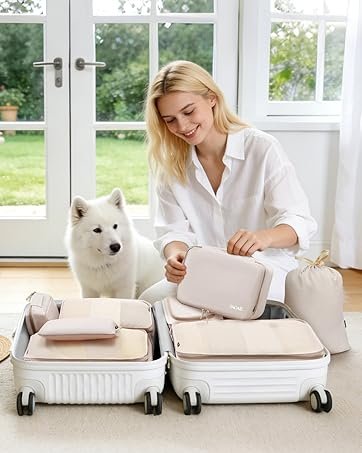Review: I really wanted to organize my packingI tend to be more messy at heart unless I hyper organize myself. I looked into the packing cubes, but some of them are expensive and some organizational tools just don’t work for me and I didn’t want to spend the money to find out it didn’t workI also tend to pack right up to the 50 pound limit so I didn’t want heavy packing cubesI’ve had these for a while now and they’ve been on airplane trips and trips to the beach for a long weekends. I adore themThey are not stiff so they are a little bit more forgiving if you overpack them and they don’t hold up their sides very well This is very fine for me. It might be not fine for someone else.My husband, bought some of his own. he spent more money and his were stii and they also had heavy metal company tags on them. They weighed too much. He ended up not liking them because the set was just all square ones and never used them and they’re probably going to the thrift storeThis set, On the other hand, had a multiple of sizes. I Use the sock bag to put all my hair items in. I put in a mirror And various hair clips and scrunchies and barrettes. Just one of each.I put my shower shoes in the pocket of the shoe bag, And I put all my shower items in the large section, Shampoo, my back scrubber my razor anything that goes into the shower goes thereI use one of the Medium bag for my bedside bag. I put a nightgown and bed socks into it I put a drawstring bag with all my CPAP accessories in it. And then I put the toiletry bag as well in it Inside the toiletry bag are my cordsOn the bottom of it vitamin box. My outlet surge protector because if you have a CPAP and electronic devices, you always need extra plugsIn the pockets, I put Reading glasses for nighttime, Lotion, lip, balm, cuticle oil, etcIn the front pockets, I put my cords and my camera chargerOK, this might seem like a lot of detail, but this is why it’s importantThe shower has a handle on top the minute I get where I’m going. I take it by the handle and in the bathroom and everything is ready to go.I take my bedside place in the nightstand and I have everything ready to go, i unpack my cords, Plug everything in and I’m ready to recharge and set up my CPAPI put the underwear bag that I also put in deodorant, sanitary pads, etc And place that where I’m going to get dressed in the morningI use one of the other bags for all my swim gearI put my swimsuit, my cover-up, My suntan lotion, Sunburn cream, Water wallet, Water shoesetc.When I’m ready to go to the pool, I just open it up get dressed and I’m good to goIf we’re tropical and we’re touring around, I might just throw the whole thing in the trunk of the car because sometimes after you’re done, you might find a beach you might want to swim in.So well, I hoped these are just make my suitcase more organized. They actually have made me so much more organized.When I return home, I clean out my suitcase and after doing laundry, I repack them so that I’m almost ready to go in a moments. All I have to do is throw my clothes in my suitcase. It’s very helpful if you have elderly parents or other reasons you might need to pack quickly, like a traveling jobI would s get these again, in fact, I’m thinking of getting another set.If you’re new to packing cubes, I would recommend these. They are lightweight and they are good economic way to try them out. It’s nice that they come in a multitude of colors.I made a list of everything that goes in them a little little business cards and laminated them and attached them to the zippers so that it makes it super easy to pack whether I am home or I am packing up at my destination so I don’t forget anything.