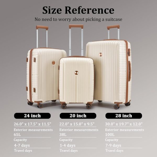 Reviewer: greenmama Rating: 5.0 out of 5 stars Title: LOOKS PREMIUM / EXPENSIVE, DUARABLE MATERIALS, NICE DETAILING, Review: VERY NICELY MADE SET – YKK ZIPPERS – LOOKS PREMIUM / EXPENSIVE, DUARABLE MATERIALS, NICE DETAILING, THE ONLY NEGATIVE IS THE CARRY ONE SIZE IS ABOUT 1″ SMALLER IN ALL DIRECTIONS THAT ALLOWED AND IT DOES NOT HAVE EXPANSION CAPABILITIES – VERY GOOD VALUE – HIGHLY RECOMMENDED – THEY ARE CURRENTLY IN SCOTLAND WITH MY DAUGHTER AT COLLEGE Reviewer: Brittany Watson Rating: 5.0 out of 5 stars Title: Nice and durable but beware of scuffs marks Review: Update: customer service reached out about broken zipper and they were very helpful. Great company.Very pretty color and holds a lot. If flying it does get scuffed and dirty very easily and everything shows up. Disappointed with the large sized suitcase as I used it for the first time and the large pocket inside zipper broke and won’t zip up and everything spills out. Its durable and held up flying from US to Italy but would purchase a darker color instead and not happy with the zipper breaking after one use. Reviewer: Francesca Rating: 4.0 out of 5 stars Title: Cute and overall good, but inner zipper issue Review: Very cute and seems to be durable except for inner zipper. With initial use, both of the larger suitcases inside zipper broke 🙁 (the one that separates the top of the suitcase from the bottom) Reviewer: Amazon Customer Rating: 5.0 out of 5 stars Title: Japan Review: Great luggage! Lightweight, sturdy, and easy to roll. The wheels are smooth, the handle feels solid, and it fits everything I need for a long trip. Definitely worth the money. Reviewer: Luke Rating: 5.0 out of 5 stars Title: Great Quality and Value Review: Love this set! The quality is great and they are super durable! Great value for the price! Reviewer: Alesia Rating: 5.0 out of 5 stars Title: Product Qualiy is Good for the Price. Review: I wanted to take our 7 hour airline trip with two airport transfers each way before rating this item. At first I was a bit skeptical because the case felt a bit flimsy, but the lighter weight helps when trying to keep within the 50 lb limit. I was pleased to see that the luggage held up and still looks good. No damage. The zippers work decently and we even packed tightly. The combo lock is made out of plastic but still held and the dials were easy to set once the numbers were set. The large luggage is within TSA limits and all cases rolled very nice and smooth in the airports. The sizes are perfect for all that my husband and I needed to take on our trip and the smaller hard case fit perfectly under the airplane seat. I may buy another large suitcase buy itself just to have, one for my husband and I that are the same size. Reviewer: Robin Fritz Rating: 1.0 out of 5 stars Title: Not your mother‘s suitcases. Review: Sure, they looked great in the pictures! We ordered the full set for our first vacation in six years. We used three of the five bags to fly from California to Hawaii and back. We made it back, the bags not so much. As we were packing, we realized very quickly that the interior zippers were simply for looks. All of the interior zippers on all three suitcases were broken before we even left. Not totally a problem, but not very convenient when you open the bag and half of your stuff comes flying out at you cause there’s nothing holding it in. We didn’t realize when we arrived at our destination that the wheels and corners were barely hanging on. By the time we returned home, at least two corners of each of the three bigger bags were cracked, and the wheels are now wobbly. I understand that for the price you can’t expect the world, but I truly had hoped that we would be able to make two or three vacations with these bags and sadly that will not be happening. Don’t buy these suitcases unless you are going to transport them in your own vehicle 100% of the time. Airline transport and these bags do not mix. We did give the suitcases one star for the color. That is the only positive I can come up with at this point. Would love to return them, but I’m pretty sure Amazon will say no. If you’re looking for a quality suitcase that you can use for more than one vacation, these are not that suitcase. Reviewer: MT Princess Rating: 5.0 out of 5 stars Title: Good value Review: Stylish luggage set with lots of great features. Spinner wheels, attractive details and TSA approved locks. Just what we wanted.