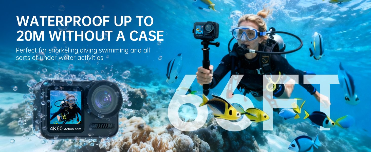 4K 60FPS Waterproof Action Camera,Bare Metal 66FT Underwater Camera,2″ Touch Dual Screen Sports 6-Axis Stabilization,2 Batteries Internal Microphone Vlog Camera for Diving Cycling Outdoor