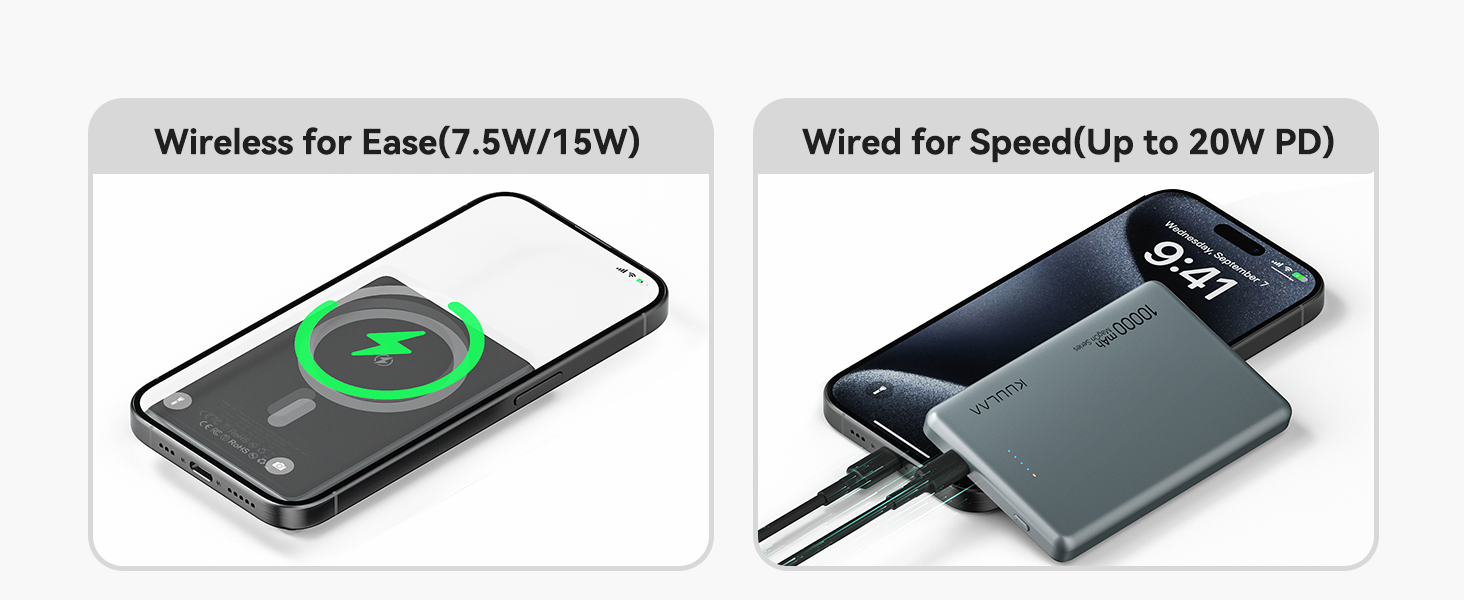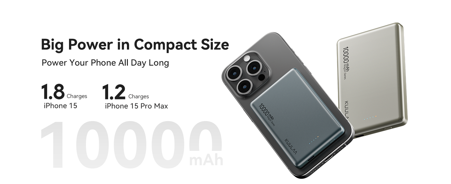Add to Cart Add to Cart Add to Cart Add to Cart Add to Cart Add to Cart Add to Cart Customer Reviews 4.4 out of 5 stars 24 4.4 out of 5 stars 24 5.0 out of 5 stars 4 4.3 out of 5 stars 1,617 4.1 out of 5 stars 1,211 4.2 out of 5 stars 2,282 5.0 out of 5 stars 2 Price $39.99$39.99 $19.99$19.99 $31.99$31.99 $16.99$16.99 $14.98$14.98 $23.49$23.49 $19.99$19.99 Capacity 10000mAh 5000mAh 5000mAh 5000mAh 4500mAh 5000mAh 20000mAh PD20W ✔ ✔ ✔ ✔ ✘ ✘ ✔ Wireless Charging ✔ ✔ ✔ ✔ ✔ ✔ ✘ for Magsafe Battery ✔ ✔ ✔ ✘ ✘ ✘ ✘ Input Ports USB C USB C USB C USB C USB C USB C USB C Output Ports USB C USB C USB C USB C USB C USB C USB C/USB A Power Indicator LED lights LED lights LED lights Digital Display LED lights Digital Display Digital Display【Two Times Extra Power】With a massive 10,000mAh capacity, this Kuulaa slim magsafe battery pack can charge your iPhone 13 Pro up to 1.6 times, wireless charges for 40 hours of video playback, while other 5,000mAh batteries drain fast and fail to give a full charge.