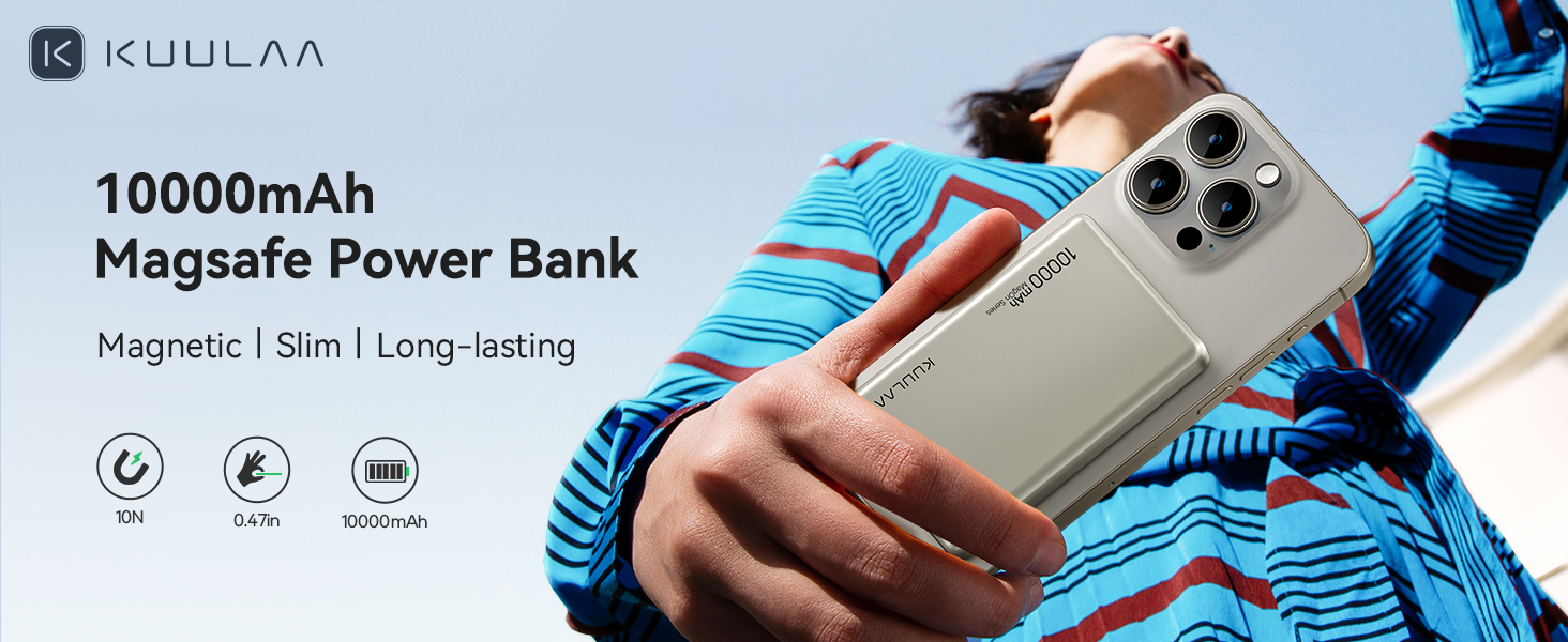 Kuulaa 10000mAh Magnetic Portable Charger Slim Magsafe Battery Pack 0.47” Power Bank Support USB C PD 20W Fast Charging, Compatible with iPhone air/16/15/14/13/12