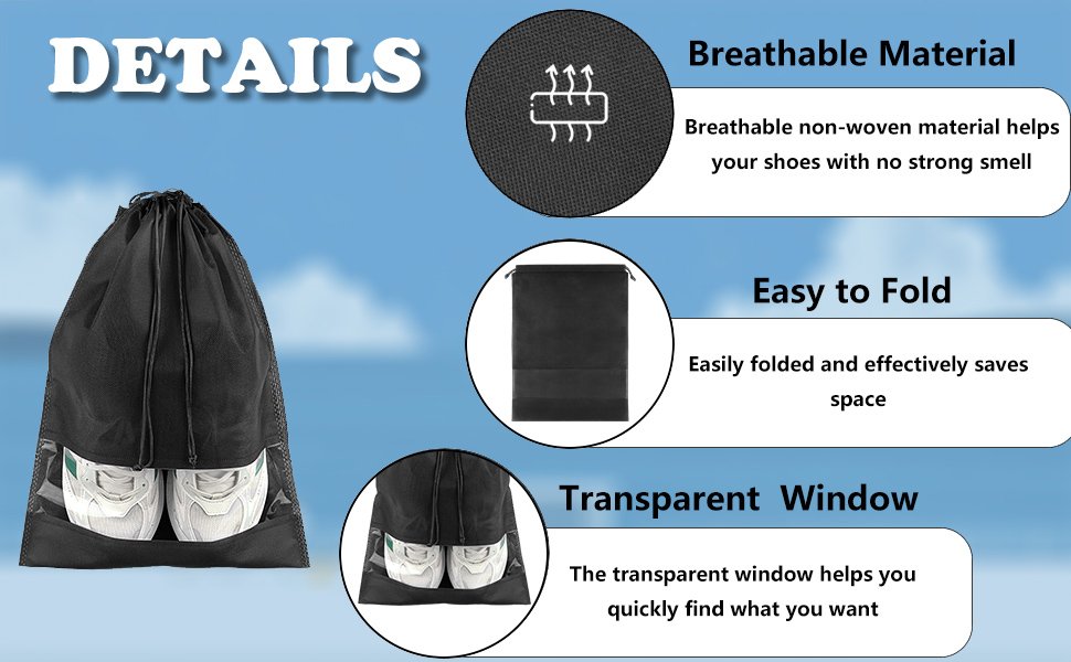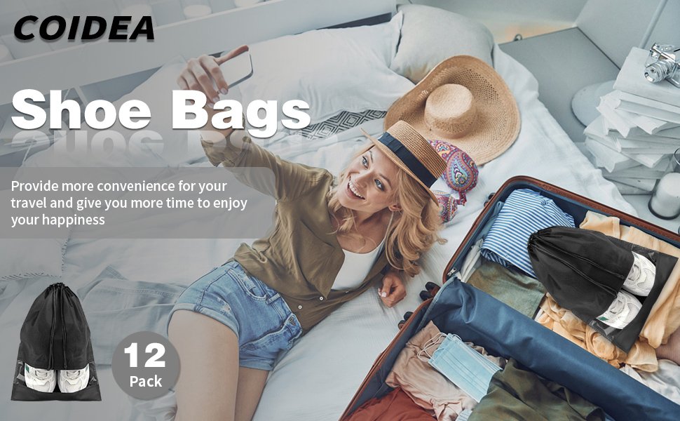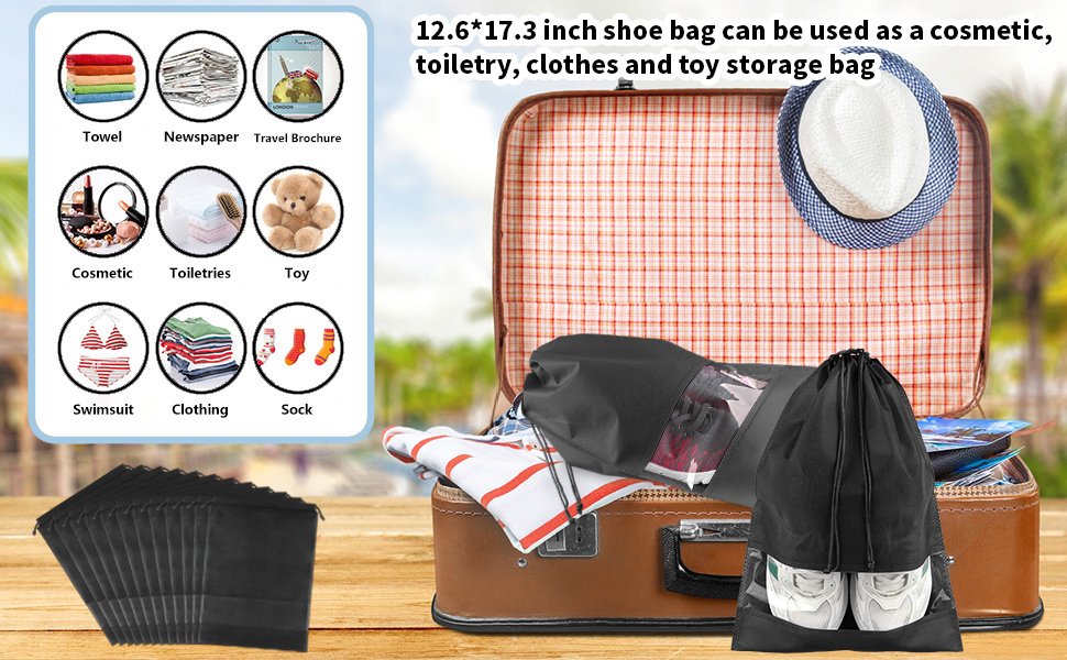 12 Pack Large Shoe Bags for Packing with Clear Window, Dustproof Drawstring Travel Shoe Storage Bags for Men & Women, Black