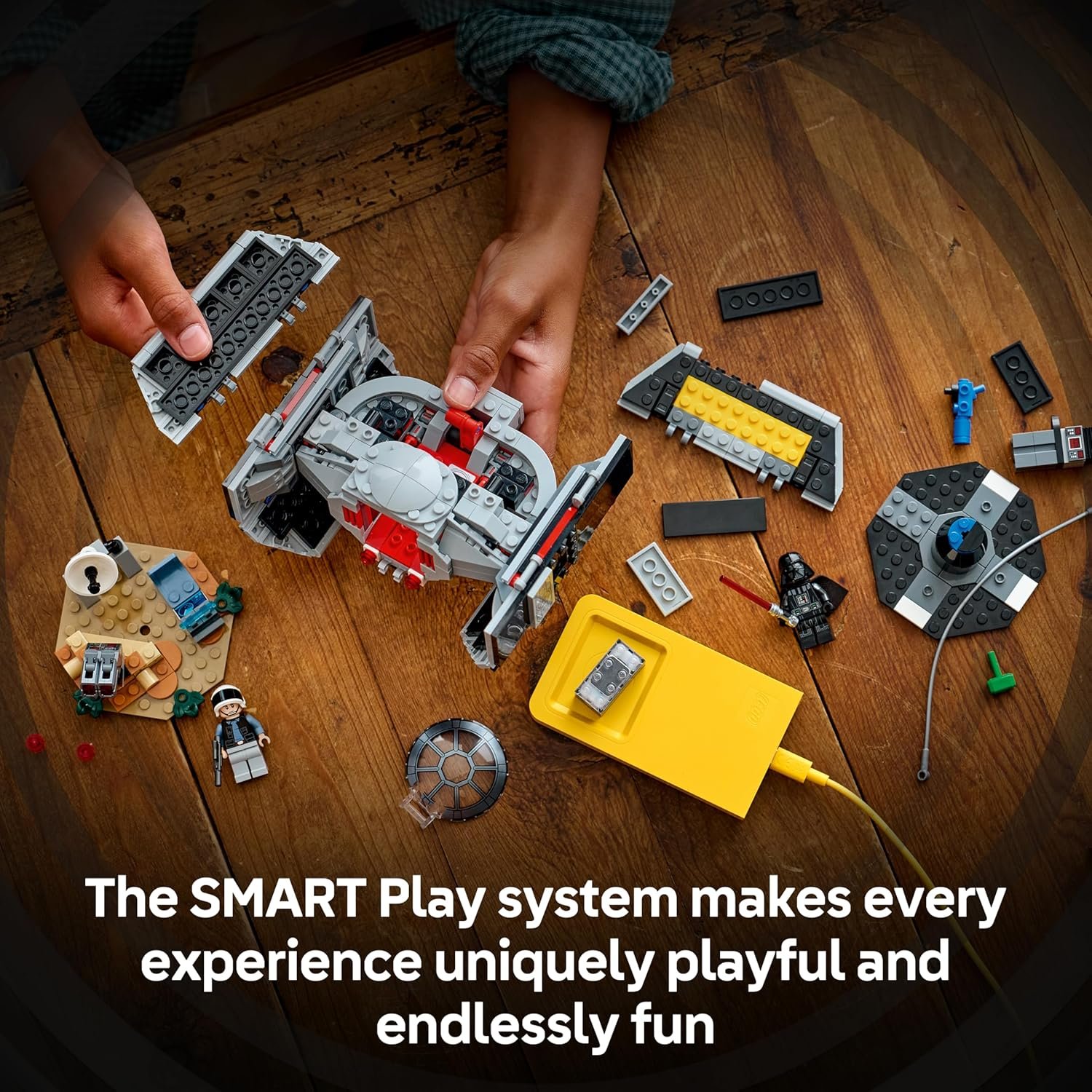 POWER UP THE TIE FIGHTER – Place the SMART Brick on the SMART Tag in the starfighter for motion-activated engine sounds and lights, laser-shooting, refueling and repair sounds