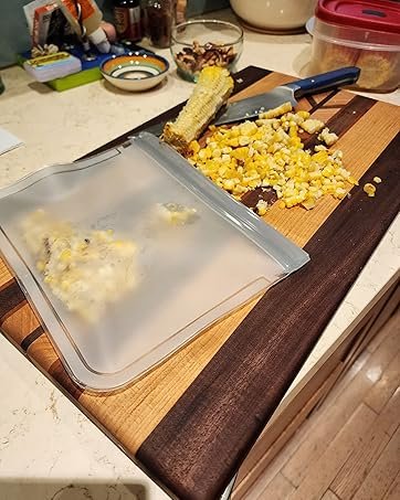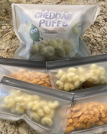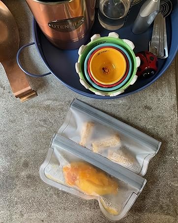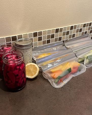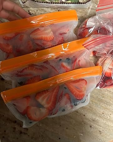 Reviewer: Brandy Rating: 5.0 out of 5 stars Title: Reliable / easy to use & store! Review: These are amazing little reusable bags! I bought the multi pack set a year ago and still use them daily! I bought another brand first and didn’t like them because they were not dishwasher safe. These are (on top rack WITHOUT heat dry / sani wash on)! I did try washing a few with those dishwasher options on and they survived and still work, but are a little harder to close. When I use “normal” settings – no issues at all & super easy to clean even if you want to hand wash them. They seal up wonderfully and do not leak! They are great in fridge, pantry & freezer safe as well. I assumed I would need to replace them eventually as the material wears, but a year later they are still going strong. I did recently but more (quart / sandwich size) because those seem to got used most in my house & I think teens maybe leaving them places. 😣. HIGHLY recommend this brand if your looking for quality product that will last and work when / where needed! Apparently they now have a drying rack too? I’ve been drying on a glass or turning inside out to dry, but now that I see they have one made for these bags … the drying rack is my next purchase! Reviewer: Sarah Da Rating: 5.0 out of 5 stars Title: Better than disposable bags Review: Well worth it as a reusable plastic bag. It is a bit hard to dry out completely and you have to be more deliberate with the interlock part. Very durable Reviewer: Great Dane Rating: 5.0 out of 5 stars Title: Good for the planet and stops you from wasting money on tossable plastic bags Review: I’ve been trying to find solutions for kitchen food and small item storage that is better for the Earth and better for my wallet. These reusable silicone bags are THE BOMB! The bags are stronger than a standard ziploc, have a strong zipper that holds tight and you don’t have to fiddle with it to get the two parts to seam together. They don’t stand up on their own, but neither do the single use bags I use to buy.Silicone is non-toxic and reusable, so there’s no waste and no health issues. The sizes are nice and comparable to the ones you’d buy at the store. I’ve used them for leftover pizza, sliced veggies, leftover pasta, and to thaw frozen meat in in cold water … no leaks! They clean easily, even without a dishwasher. I turn them inside out to wash and dry by hand. I don’t know why I didn’t buy something like this sooner.It feels really good every time I DON’T throw a plastic bag in the trash. I’m going to buy more and probably some for some relatives who are on fixed incomes and don’t need to keep wasting money on single use plastics. Brilliant product!!! The photo shows the three sizes in comparison with a standard paper plate. The plate will fit in the large bag easily with leftover pizza, etc! Get some now! Reviewer: Harmeet Rating: 4.0 out of 5 stars Title: Great bags, hand wash preferred Review: Great quality reusable bags! They feel premium and all the variety of sizes are great. They are also easy to seal just like regular zip lock bags. I would recommend handwashing even though they can be put in the dishwasher, but they don’t clean all that well inside the dishwasher due to them always folding over themselves with the water pressure. Reviewer: Nicole Cole Rating: 5.0 out of 5 stars Title: Quality Review: Nice! Easy to wash and seem pretty durable. Reviewer: Old Southern Charm Rating: 5.0 out of 5 stars Title: Functional, and as advertised! Review: I use different sizes of the bags every day – garlic and ginger stored in the freezer – open those bags at least 5 days/week. I pack the medium sized ones with apples, oranges, and boiled eggs for a mid-day snack, and have effectively moved away from single-use bags. The closure is dual rows and provides a very effective sealed closure. The small ones, of which there are the most in number, are really QUITE small. I mostly utilized the medium and large sizes. I hand wash them after every use, and occasionally run them through the dishwasher on an upper rack – thus far, the quality is there, usability, refrigerator, freezer, time in the car every day (8 – 10 hours) – no discernible wear or damage. Love them! Reviewer: CatMom Rating: 5.0 out of 5 stars Title: Great product Review: Love this product ! Easy to clean, durable and they don’t leak at all! I love not having to use so much single use plastic. I’ve bought other sets to give to family members and they love them too! Reviewer: Nicole Rating: 3.0 out of 5 stars Title: Good product Review: I liked these- but didn’t love them. They stain easily from what you put it in. All of mine have mustard stains from sandwiches haha. I like that they are freezer safe, leak proof, and dishwasher safe, but they can kind of be a pain. If you wash them well, I have never had an issue with smells. The zipper seal is kind of a pain too, and can be hard to seal or open. It’s definitely a sacrifice to use these instead of disposable ones. But it’s for the good of the environment!!! Worth the work. Reviewer: Emily Rating: 5.0 out of 5 stars Title: Review: very good, quality is great, they do the job and are easy to clean. Reviewer: Mots Rating: 3.0 out of 5 stars Title: Review: These look fab. They’re great as long as you have d wash them. I tried them in the dishwasher – top rack as per the advertised photo but the larger bags didn’t wash properly and also one of the middle sized bags split. Reviewer: María C. Rating: 5.0 out of 5 stars Title: Review: Muy prácticas. Cierran muy bien y los tamaños están genial para toda clase de cosas . Las estoy utilizando para congelar comida y funcionan bien, además se Labán en lavavajillas si es necesario .Las recomiendo para dejar de emplear bolsas de plástico de un sólo uso, a la larga sale mucho más barato y más ecológico Reviewer: J.O. Rating: 5.0 out of 5 stars Title: Review: Ich bin absolut zufr