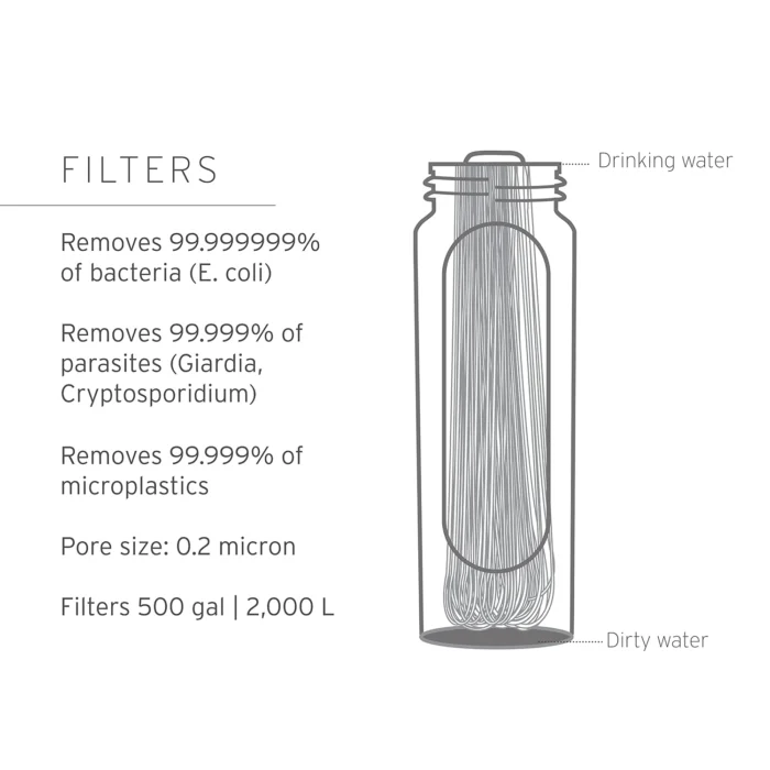 Protects against 99.999999% of bacteria (including E.coli, Salmonella), 99.999% of parasites (including Giardia and Cryptosporidium), 99.999% of microplastics, silt, sand, and cloudiness