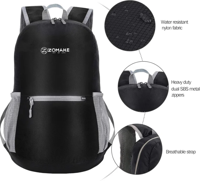 0.5 POUNDS OF PORTABLE ULTRA LIGHTWEIGHT PACKABLE BACKPACK: The size of the travel backpack packable is 17.71 x5.5x 10.6 inches,and the folding size is 6.7 x 6.7 x 1.97 inches.The lightweight foldable backpack is an ideal luggage bag for a plane.When it is not used,fold it into a compact pocket (sandwiches size).It can be stored in anywhere in pockets,luggage,handbags,etc 20L ULTRA LIGHTWEIGHT FOLDABLE BACKPACK: Our packable hiking backpack water resistant capacity is 20L,the pocket distribution is reasonable,and items are stored in an orderly manner.The main bag is stored clothings,and tourist guidelines in inner partitions.One front bag stores small equipment such as mobile phones,mobile power supply,and two side bags store umbrellas,water bottles or sunglasses.Our small foldable backpack meets the needs of carrying lightweight items QUALITY ULTRA LIGHTWEIGHT PACKABLE BACKPACKS: Our ultralight foldable backpack are nylon materials for water resistant and tear resistance,and the water resistant performance is good (note:≠completely waterproof).We use double-layered wear-resistant new processes to strengthen the suture of the small packable backpack.A zipper made from two-way SBS metal and high-quality resin materials to avoid the zipper is stuck.The smooth zipper can give you a good sense of experience ELABORATE DESIGN: Our ultra lightweight foldable backpack adopts the latest back design to effectively reduce the pressure of the shoulders;According to ergonomic design,it can meet different people,old people.Anti-light strip is designed at the front bag zipper and two side bags,which play a protective role during the night walk GET THE AWARD-WINNING ZOMAKE ULTRA LIGHTWEIGHT FOLDABLE BACKPACK: With the light performance and high quality of our ZOMAKE ultra lightweight backpack,we have provided high-quality services to 500,000 people in the world and received praise from many people.I believe that our light foldable backpack will be the perfect partner in your life.You can accompany you on foot,vacation,shopping,cycling,and exercise! %$#