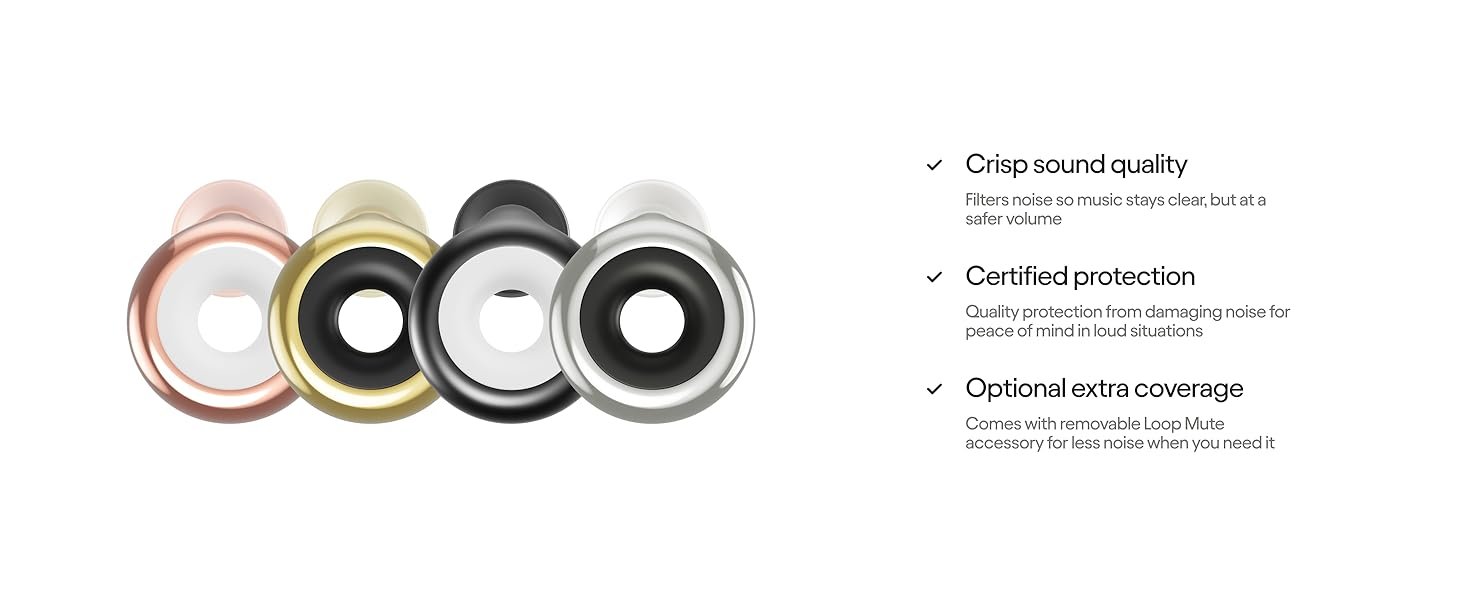 Review: I wore these Chrome Colored Loop earplugs to a recent music festival and I’m so glad I did! The 17 dB noise reduction was just right—it softened the volume without taking away from the music, and I could still hear everything clearly. I also used the mute option during especially loud sets, and it gave that extra level of protection I needed. They made the entire experience so much more enjoyable—no ear fatigue, no ringing afterward, just pure enjoyment of the music. Super comfortable to wear all day and they stayed in place perfectly. Stylish, effective, and absolutely worth it!
