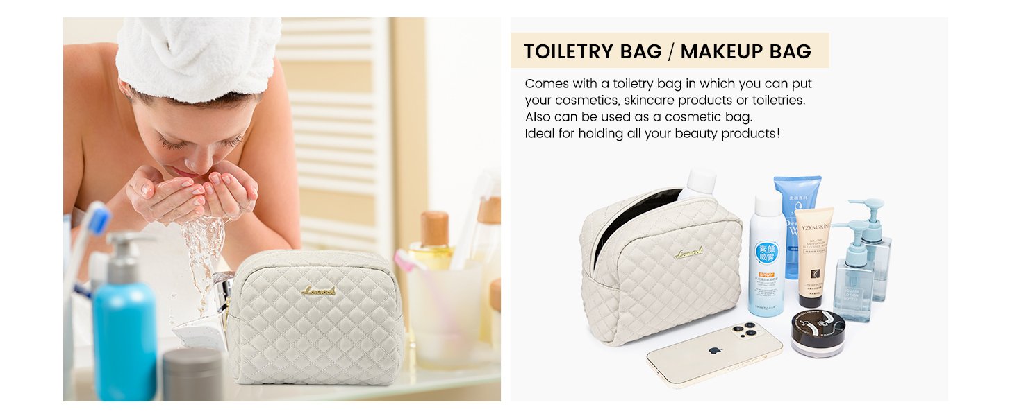 Review: Really classy looking quilted bag. I bought the black because it was available overnight! Like the brass trim. Comes with a makeup sized bag. Shoulder strap has padding. Three mesh pockets inside not sure how usable they are but do hold a baby wipe pack lengthwise. Waterproof zippered pocket for swimsuit or wet baby clothes. Two outside pockets one has a zipper. Wish it had a water bottle holder and the outside pocket were bigger for a paperback book. But overall very happy. Will update after I return from my trip.