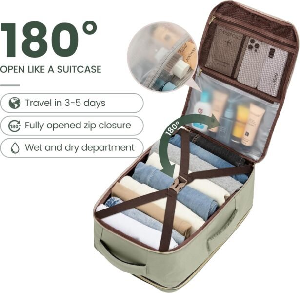 Review: This is a very roomy backpack. Also comes with a shoe bag and a cosmetic bag. One side zips open like luggage which is awesome and makes packing it easy. Has room on the side for a tumbler that you can lock in place. Has a lot of little pockets inside ,so you definitely have places for all your stuff big and small. You can use it as an extra bag along with your carry on for a plane. Or alone as a carry on. It fits the size requirement.
