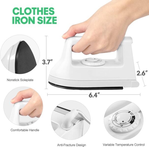 Specification: Condition: 100% Brand New Item Type: Electric Iron Size: Approx. 6.49 x 3.74 x 2.6 inches Usage: Use with power cord and plug Packing list: 1 x Iron 1 x 1.5m long power cord plug Note: Due to manual measurement, please allow slight size error. Due to different monitors, please allow slight color difference. Clothes Iron Size: We have upgraded the original mini size. The existing size is about 165 x 95 x 65 mm / 6.49 x 3.74 x 2.6 inches, equivalent to the length of 1 smartphone. This small iron provides 110V designed for the US.After the upgrade, small iron is easy to carry and store, and improves work efficiency, bringing you a lot of convenience; please see the size clearly and place an order according to your needs. Easy to Operate: After iron for clothes is powered on, irons for ironing clothes is upright, and the ironing can be started when the temperature is suitable. Different gears can be selected according to different objects. Do not unplug the power cord during use. After use, turn off the power and let it cool down naturally. Practical: Travel Iron Mini is suitable for people who like crafting and DIY, and also for housewives who iron clothes for their families. You can use clothing iron to make all kinds of small things, such as iron beads with name stickers, diamonds, etc. Practical tools can help you achieve this easily. Great Gift: The small heat press is perfect for craft lovers, students and housewives. You can give it as a gift to your friends, parents to impress them. Features: The upgraded mini craft iron is easy to carry, the handle is comfortable to hold, and ironing is easy. The shell of heat press is made of resin material, with high strength and good toughness. The heating is made of ceramic material. Irons for quilters can be preheated in 1.5 minutes. Mini iron for sewing can easily meet the ironing needs of different clothes. Long-term power-on does not overheat, use it with confidence. %$#