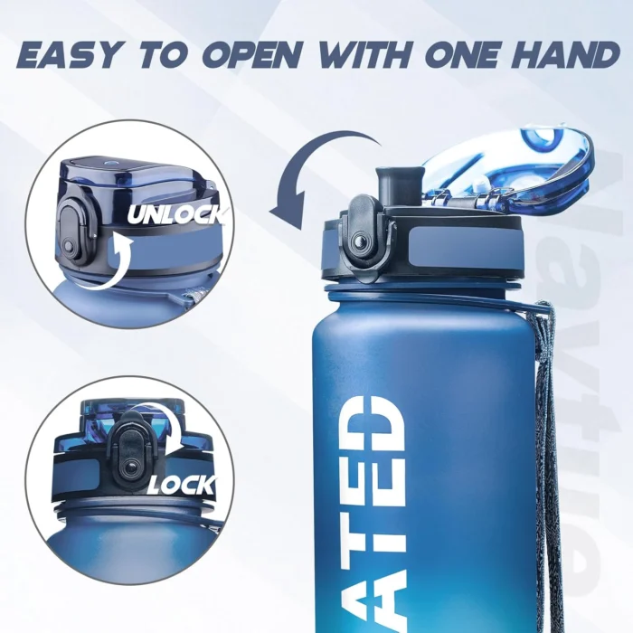 Reviewer: dale e. Rating: 5.0 out of 5 stars Title: Great water bottle Review: I really like this bottle, it looks great, it’s a good size for work or whatever, I like the hole in the top and vent for easy drinking, it’s also spring loaded and snaps closed well when not in use. I also bought my wife one so she’d stop lugging around the over sized gallon jug she had that was just ridiculous. Reviewer: T. Sanchez Rating: 5.0 out of 5 stars Title: Nice and easily transported water bottle. Review: Lightweight and easy to carry. Fits in areas where disposable plastic water bottles fit, which is nice since I don’t have to buy bottles over and over again. Works great for the gym. Easy to drink out of. Water flows easily out of bottle when drinking out of it. Reviewer: sweet pea Rating: 5.0 out of 5 stars Title: Nice water bottles Review: I am so glad I bought these water bottles. I do not like to drink water but know I should. It makes it easier to drink as it shows how much to drink every hour which makes it more doable for me. The only drawback is they are not insulated, but if they were you would not be able to see the amount you have drank so you have to weigh which is more important to you. For me it was more important to see the amount I needed to drink by the hour. Reviewer: free-gone Rating: 4.0 out of 5 stars Title: Important: No leak water bottle Review: Good water bottle. No leaks. The paint on the outside on the bottom is starting to scratch or rub off, but i do use the water bottle outside and keep on the ground. I love the flip top on these. I have 3! Reviewer: Felipe Rating: 5.0 out of 5 stars Title: Worth buying and great for bike holders Review: The NAVTUE water bottle is better than I expected. It fits in my stationary bike water bottle holder as well on all of my backpacks. The spring release opens that bottle with no problems. It’s easy to hand wash. I like that there is a latch that goes over the opener preventing the lid from opening. The best part is that the water flow easily out of the bottle. Reviewer: Mrs. B Rating: 5.0 out of 5 stars Title: Just the right size, perfect for school Review: Love this water bottle. I needed a school water bottle for my middle school-aged son. I did not want to send a new disposable one each day and I did not want a metal one because of the weight it adds to an already heavy backpack. I also wanted it to be similar in size to the store bought ones for the purpose of fitting in his bag. Most 16 oz ones are very childish, so finding this was amazing – basic color for a boy. Easy to refill at home and school. Has measurements/time table on the side that he tries to follow for fun. Drinkable spout. The lid also locks so that it doesn’t open by mistake in his backpack. A wristlet is attached for easy carrying. Washing out is easy because it has a wide opening. It is holding up well. It is perfect! Reviewer: Cliff campbell Rating: 3.0 out of 5 stars Title: Eh. Review: It works ok but it’s just a water bottle. Ice melts in an hour. Reviewer: Samantha Guillemette Rating: 5.0 out of 5 stars Title: Love this bottle ! Review: Love these ! Makes getting daily water in easier! Reviewer: Tina W. Rating: 5.0 out of 5 stars Title: Review: Die Flasche ist super! Schön groß, funktioniert auch mit Kohlensäurehaltigen Getränken und durch das kleine Luftloch Oben kann man gut trinken, ohne das ein Unterdruck entsteht. Somit trinkt man automatisch mehr. Reviewer: Kerstin Rating: 5.0 out of 5 stars Title: Review: Habe die Flasche täglich bei der Arbeit dabei und trinke dadurch mehr als vorher, da ich sonst immer vergessen habe etwas zu trinken. Die Flasche ist dicht und es läuft nichts aus.Ich kann sie nur weiterempfehlen.l Reviewer: Edzia Rating: 5.0 out of 5 stars Title: Review: Nutze sie tagtäglich! Reviewer: Najarian Majid Rating: 4.0 out of 5 stars Title: Review: Very Good👍 Reviewer: Amazon Kunde Rating: 2.0 out of 5 stars Title: Review: Die Flasche ist ganz ok. Bei diese Qualität gibt es viel günstiger in normalen Geschäften. Einfach enttäuscht.