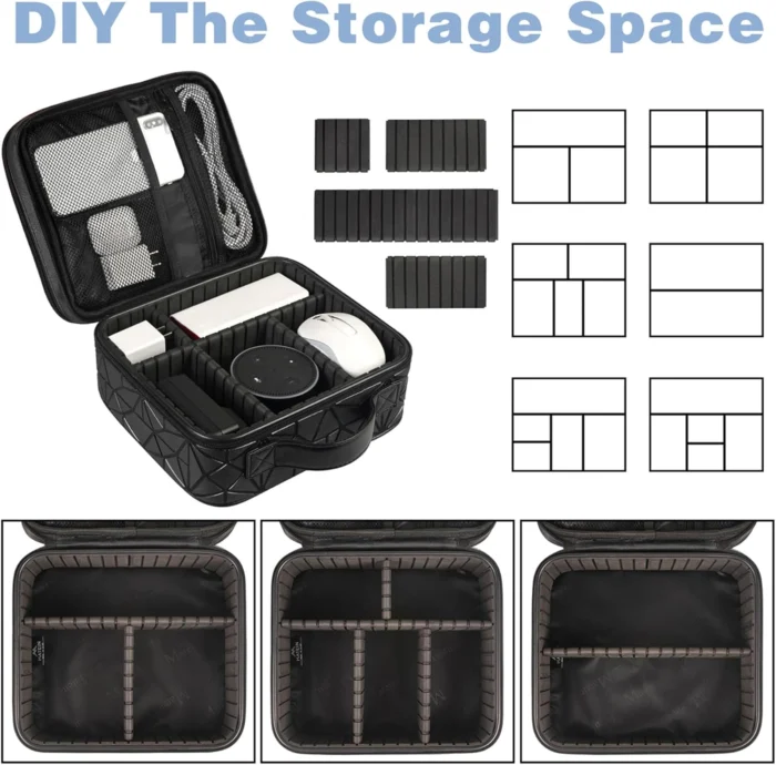 Double Layers & Organized: With two main separate layers, cable organizer box keeps electronics accessories well organized. Plenty of pockets well made for Flash Drive, SD Card, Phone. Different size of elastic bands for USB Cable Cord, Power Bank, Earbuds. Keep all your gears easily found Waterproof & Shockproof: The surface of this Electronics Organizer is made of Advanced & Water-resistant PVC material which has a strong waterproof effect providing great protection for your stuff from getting wet. Padded foam and sturdy PVC honeycomb board offer a shockproof function Diy & Large Capacity: This Cable Organizer has an amazing storage space. Four removable strong shock-absorbing partition protect all items inside from scratches, impact and accidental falling. According to your needs, you can easily carry out various items. A variety of design layouts bring unlimited possibilities to your storage space Excellent Design: The Travel Cord Organizer is built with new stylish design concept. Brand-new texture material has a shiny effect under the light. Double Zippers for you to take out the items quickly. Comfortable and sturdy leather handle ensure for long time using. Perfect tech gifts for your friend, husband, father Portable & Travel Easier: Size: 10×8.85×4.72 Inches. Compact electronic organizer travel case can be easily put into your backpack and luggage, convenient for travel, work, vacation. If you are tired of the messy storage, this will be your best electronic organizer helper %$#