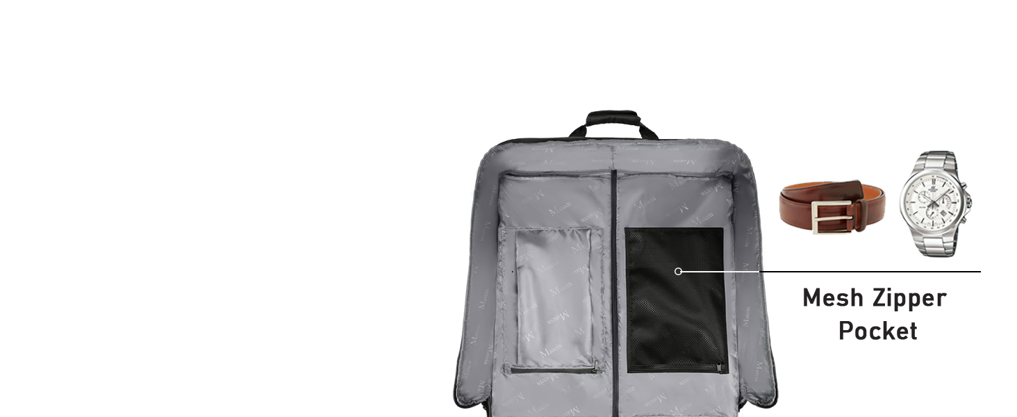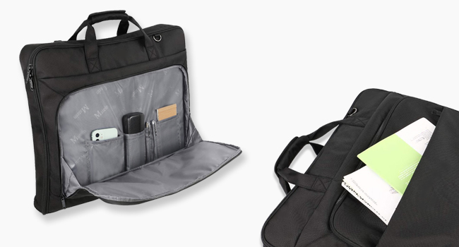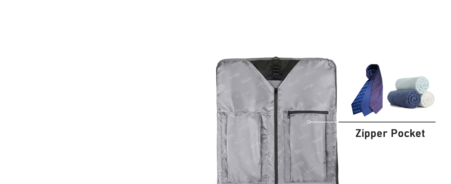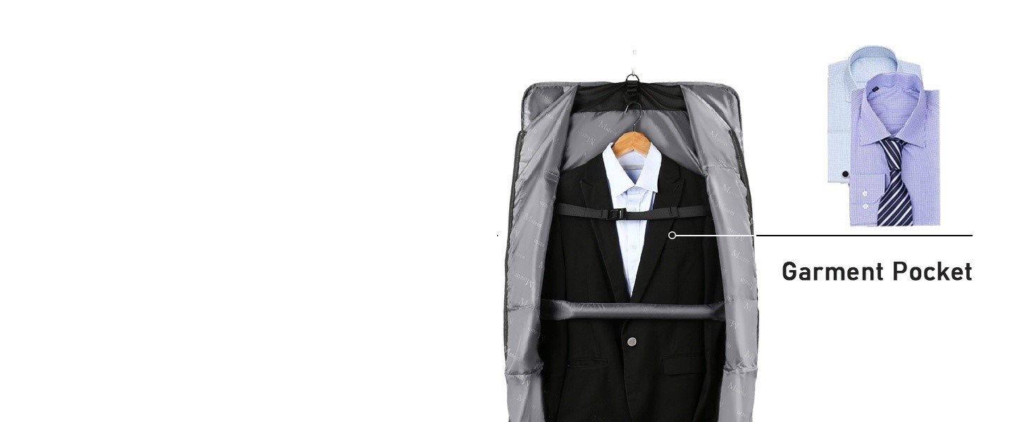 AMPLE SPACE & PLENTY OF POCKETS: Travel garment bag with the main compartment for hanging clothes,carrying a suit, uniform, coats, dresses; As suit bags for men travel, 2 internal zip pockets with large capacity for carrying shirts, ties, personal toiletries; The pocket with hook and loop is great for shoes; Extra external pockets for carrying business documents, magazine, cards. The large garment bag keeps organized