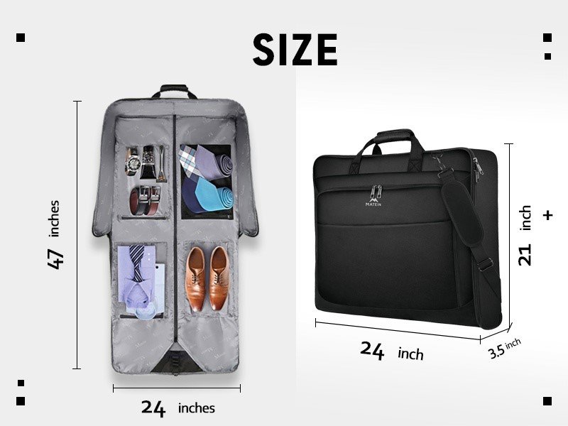 FOLDABLE DESIGN FOR STRESS-FREE TRIP: Matein suit carrier can make your travels stress-free. Its foldable design and ample space make it easy to bring along enough clothes for your trip. With its 24″ W x 47″ L opening and 24″ L x 3.5″ W x 21″ H folding dimension. This garment bag is suitable for checked baggage, with total dimensions (48.5″) that fit within most American Airlines’ checked luggage limit of 62″ (L+W+H). Travel with ease and enjoy a hassle-free trip with our garment bag