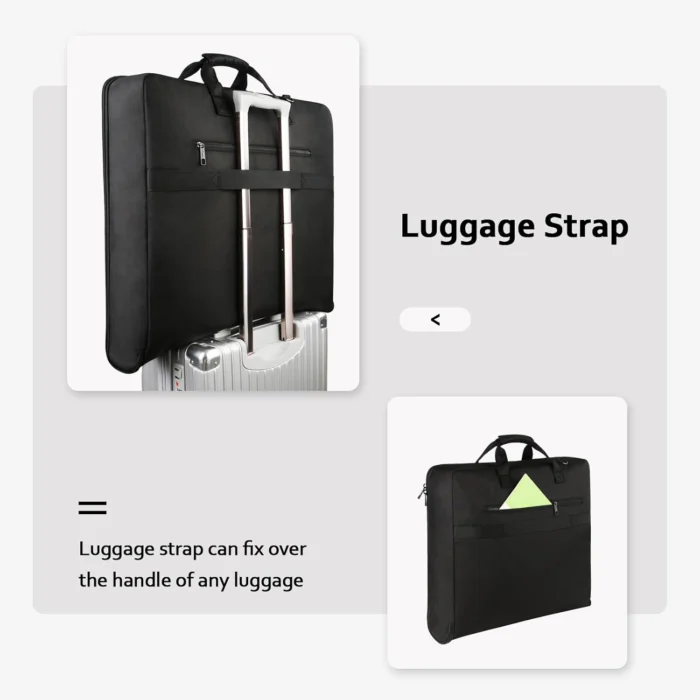 Sturdy, lightweight, and water-resistantLuggage Suitcase strap along the back is convenient for fixing the foldable garment bag on the trolley of luggage, to secure the foldable garment bag slip over the handle of any rolling luggage for hands-free transport and make traveling simplerWrapped handles, convenient and comfortable for carrying; Detachable adjustable shoulder strap can adjust it to fit your shoulder well, provide a different way to carry-on, you can take it off whenever you need. As a good valentines day gifts for him her, Thanksgiving gifts for men womenMetal Hooks of strap is Super sturdy; easy to use strap attaches to joining D rings for max support. Luggage sleeve can be anti-theft and have lost-theft functionHigh Quality Smooth Zipper is made with sturdy titanium alloy material, ensure a secure & offering long time usage to carry onPadded Foam Buckle Tie holds your garments in place, ensuring that they don’t crease or crumple during travelWell Made of High Density and Water Repellent Polyester Fabric, not easy get wet and ensure long lasting usageMetal Chain and Hook support hangup in a closet or from a door