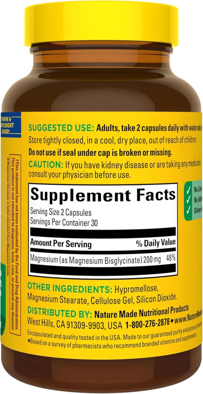 Magnesium Bisglycinate Capsules; Heart, nerve and bone support supplement: contains one 60 count bottle of Nature Made Magnesium Glycinate 200 mg per serving Capsules for a 30-day supply