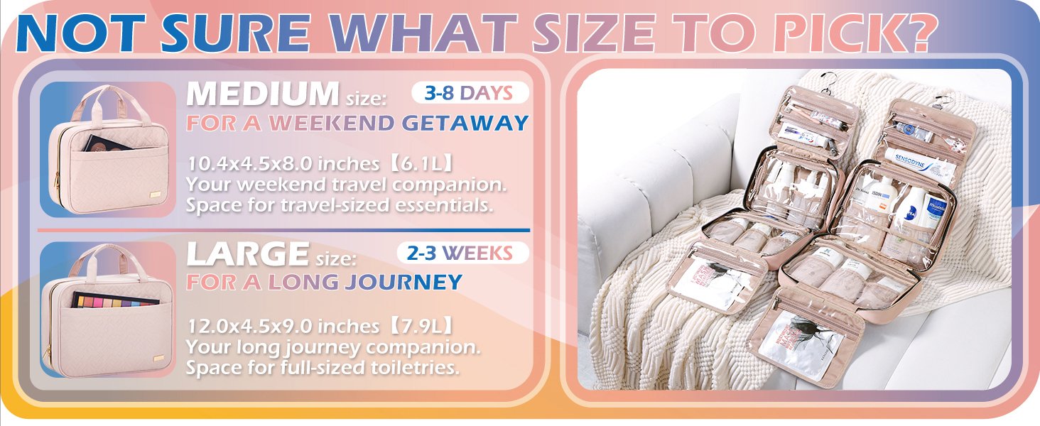 Review: This is the best and most practical lovely toiletry bag I have ever used. You can hang it on a hook on the back of the bathroom door. it fits so much. Everything is nicely separated and organized. Zippers are high quality. compartments big enough for bottles, makeup, brushes, toothpaste and brush, hair products. pads and cotton swaps etc, everything fits! easy to zip up and carry. easy to fit in suitcase. classy color pink. Highly suggest this one! L was big enough for my things. XL is too big, but only a little bigger.