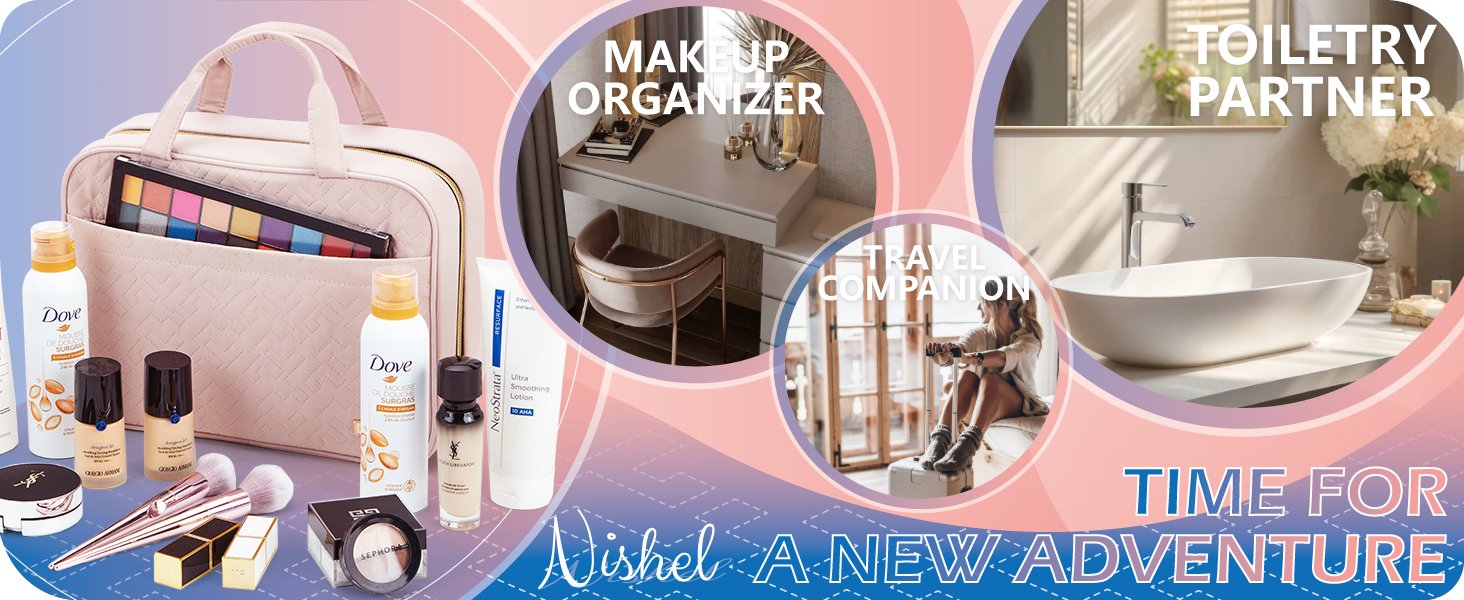 @#@ NISHEL Travel Toiletry Bag for women, Portable Hanging Organizer for Travel-Sized Shampoo, Conditioner, Brushes Set, makeup Accessories, Medium Size, Pink @@@
