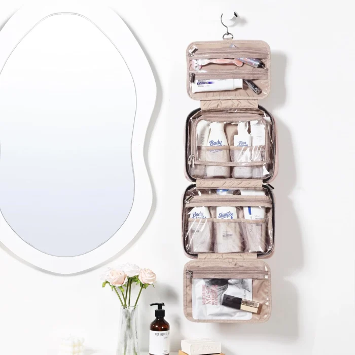 Review: I have seriously bought every travel bag under the moon. I also have this same bag in different sizes. This is the best for the over-packer. It holds everything you need in one place, and then hangs on the towel rack so you don’t take up all of the counter space. It has many different pockets and organizers, and is clear, so you can see everything and not make a mess trying to find something. Also holds full sized products. I can’t say enough good things about this bag.