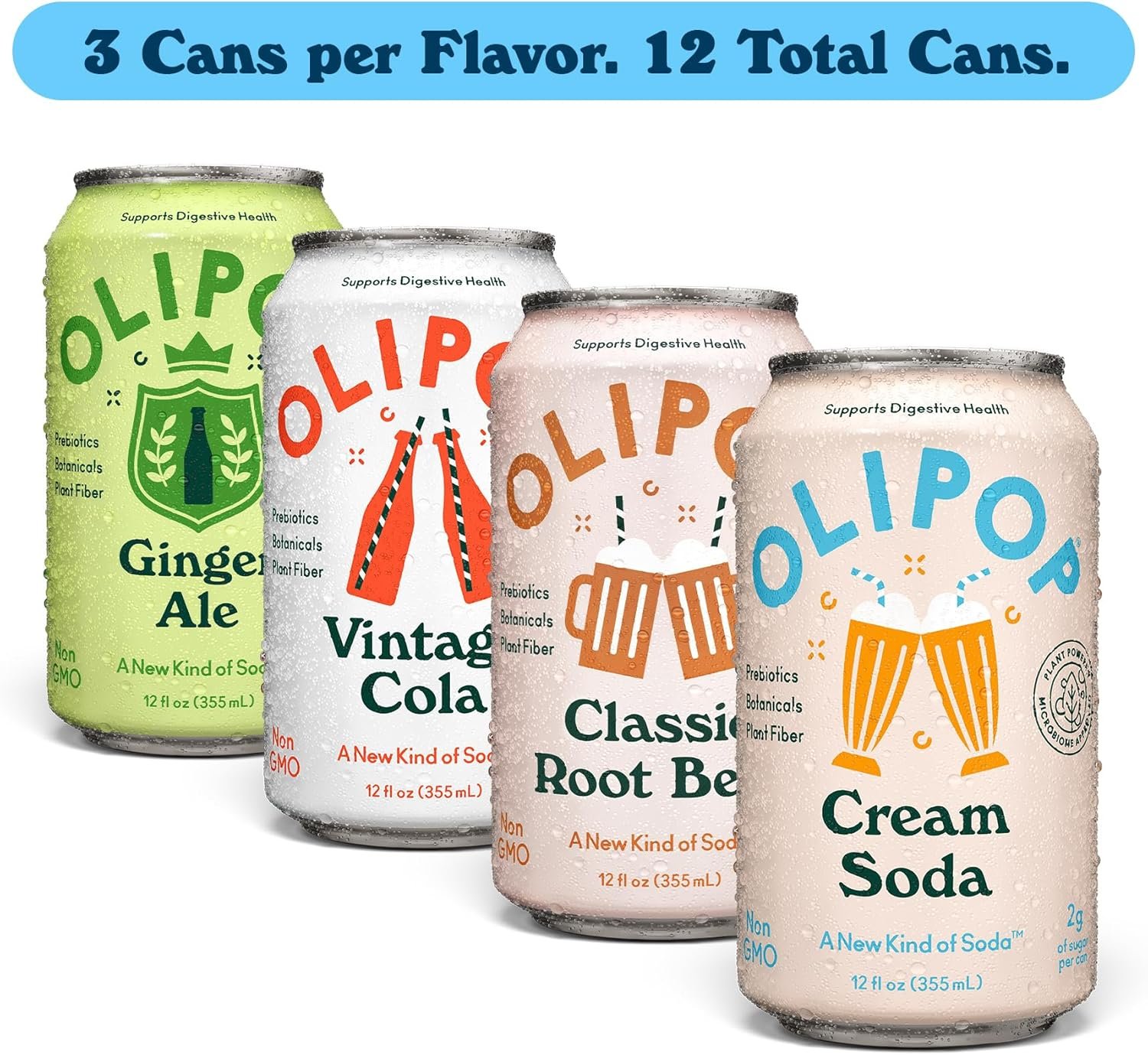 OLIPOP Prebiotic Soda Pop, Classic Soda Variety, Pantry Pack Packed with Prebiotics, Fiber, and Botanicals, Gluten Free, GMO Free, 12oz (12-Cans)