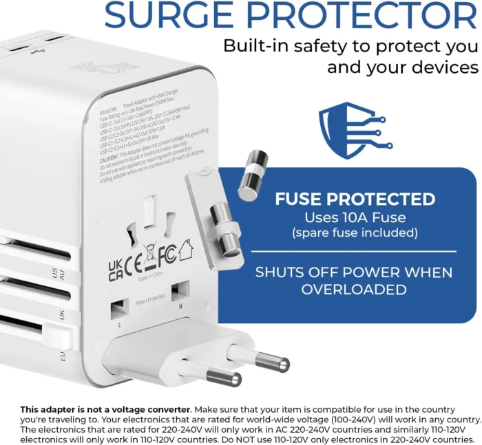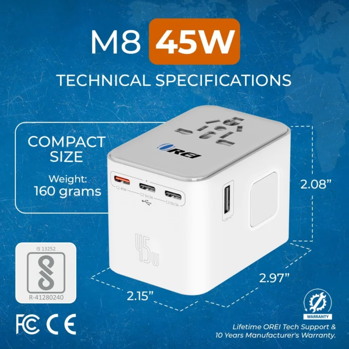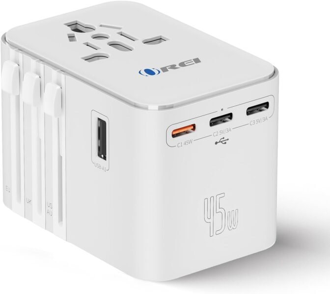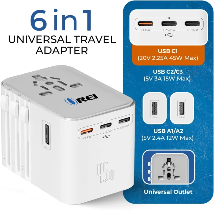 OREI 45Watt Universal Travel Adapter | 3X USBC 2XUSB A – 6-in-1 Universal Power Adapter | Universal Chargers for All Devices Compatible 150+ Countries | Type C, A, G, I Compatible