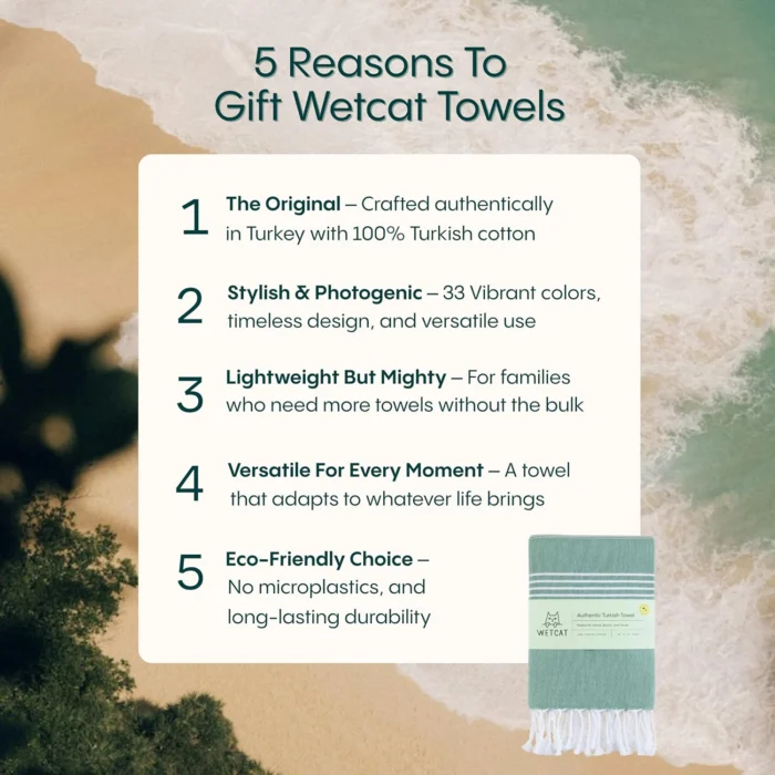 Reviewer: Ally Rounsville Rating: 5.0 out of 5 stars Title: Fun & Practical Gift Review: This Turkish beach towel makes a great gift. It’s oversized, super soft, and lightweight, but still feels high quality. I love that it’s sand-free and dries quickly, making it perfect for the beach or pool. It folds up compact for travel, and the black color looks sleek and classic. A fun, useful gift that actually gets used. Reviewer: DD Rating: 5.0 out of 5 stars Title: Large, Quick-Dry Turkish Towels Review: These Wetcat Turkish Towels are amazing! They’re large (38″x71″), super absorbent, and dry incredibly quickly, making them perfect for both home and beach use. I love their versatility—I can easily wrap one around as a sarong for a stylish cover-up. Crafted from 100% Turkish cotton, they’re lightweight, pack compactly, and even shake off sand easily, as noted in reviews. They’re a must-have for anyone looking for a high-quality, multi-purpose towel. Highly recommend Reviewer: YouNeverKnow1519 Rating: 5.0 out of 5 stars Title: Soft absorbable and lovely towels. Review: Hey! This is a woman-owned family business. We used these towels when we lived on a boat. I still use them living on land now. These are pretty, lightweight, easy to wash. Quick to dry. Good for all esp kids. I give them to guests and they give me a side look bc ppl are used to heavy towels. These dry you quickly. Are very absorbable. I just love them. Worth the price. Remember woman-owned family business. You won’t regret buying. Also I used these towels bc they don’t break the hair when you wrap up your hair when wet. 🌹 Reviewer: Tammy Wilmot Rating: 4.0 out of 5 stars Title: Best Turkish towel I’ve purchased! Review: I’ve bought 3 Turkish towels here on Amazon, all different brands from different companies/manufacturers. Of the 3, this is by far the softest. The other 2 were also a bit smaller or less absorbent. This brand is easy care, launders well with a minimal amount of shrinkage. It doesn’t shed or pill. It takes up less shelf room in the linen closet and has multiple uses; it’s a perfect tablecloth for the picnic table and works great as a beach blanket. It’s lightweight too and did I mention how soft? But for me, Turkish towels in general have a down side. During summer with the air-conditioning on, I frequently chill when I first step out of the shower. These towels provide zero warmth! I miss the way a normal fluffy towel traps body heat in. I find the tassels on each end very aggravating as they catch in my hair, my glasses or on any corner or sharp edge of the bathroom cabinet. After a few washes, those tassels just become tangled strings that aren’t attractive at all. Turkish towels also seem to pick easy. I can’t let my cat around them as her claws seem to always catch and pick. She has no effect on traditional bath towels. If these negatives won’t bother you, then I’d highly recommend this brand of turkish towels. Reviewer: Teachermom Rating: 5.0 out of 5 stars Title: Very Good Lightweight Towel Review: I looked at many different Turkish towels before ordering this WETCAT towel. We have a pool in our backyard, and I wanted a lightweight towel to sit on in an Adirondack chair that would have 3 qualities: quick drying, absorbent, and soft. Many of the reviews I read of other towels indicated that the towel had two of my three qualities, but failed on the third. I’m happy to say that this towel meets all 3 of my requirements.Know, though, before you buy this product, that a Turkish towel is different from a traditional terrycloth or terry-velour beach towel. It’s thin woven cotton. This towel is thicker than a bedsheet or a button-down shirt, but thinner than denim/chambray.Despite being thin, this towel is fairly absorbent. Is it as absorbent as a 20 year old towel that’s been laundered hundreds of times? No. But it is far more effective at removing water droplets from your skin than many cheap beach towels I’ve bought over the years. The cotton is soft, and it’s comfortable to sit on if you are not looking for something plushy. For instance, if you normally fold your terrycloth beach towel and sit on it in a beach chair as though it’s a cushion, this is not the towel for you. If, like me, you primarily throw a towel on your chair to keep your sweaty skin from sticking to the chair, then this towel works well.Finally, this towel dries MUCH quicker than a terrycloth beach towel. I spend a lot of time reading by the pool, hopping in and out to cool off. After a few dips in the pool, a standard beach towel is usually completely soaked. This towel dries quickly enough that I can sit on one end while the other end hangs over the back of my chair and dries. By the time I’m ready to hop back in the pool and cool off, I can turn the towel around and it will be mostly dry. Water tends to flow through the towel and collect in the little tassels on the ends, leaving the fabric ready to wick the pool water away from my skin again.Bonus: this towel is pretty big! It’s smaller than a “bath sheet” sized beach towel, but bigger than many “large sized” beach towels you’d find at a department store. I also read reviews of other Turkish towels that needed to be washed before the first use or that bled dye onto people’s clothes or beach bags. I used this one right out of the package, and it was fine. It also drapes nicely, and is easy to use as a wrap or cover-up.All in all, I’m pretty happy with this purchase, and I will probably buy another one. Reviewer: Crystal Robertson Rating: 5.0 out of 5 stars Title: Great For Travel Review: My husband and I went on a cruise earlier this year and I’m pretty frugal so I didn’t want to pay to check a bag so I was looking for all things light weight and compact for our carry on bags. I saw a recommendation somewhere for towels similar to these. After some research I settled on this brand. I was not disappointed and we’v