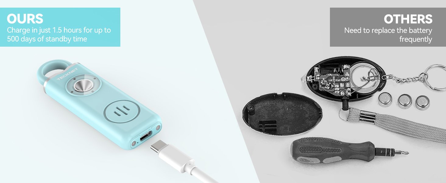 TECKNET personal alarm keychain is rechargeable via USB (included charging cable), so you can use it again and again without constantly swapping out batteries.