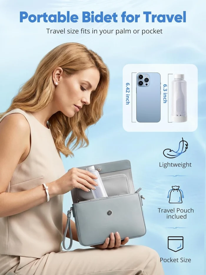 Review: The Portable Bidet is a game changer for traveling. The electric-spray feature offers a gentle and effective clean, and the adjustable water pressure makes it comfortable to use. It’s lightweight, easy to carry, and perfect for travel