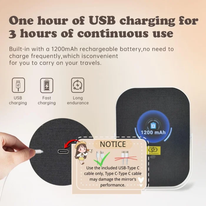 【Rechargeable Desk Vanity Mirror】 Built in large capacity rechargeable 1200mAh battery, which can be available at any time through charged by a laptop, mobile power supply or charger; Ultra thin, compact and lightweight, easily placed in your backpack, suitable for travel, hotel, home or other cosmetic occasions.