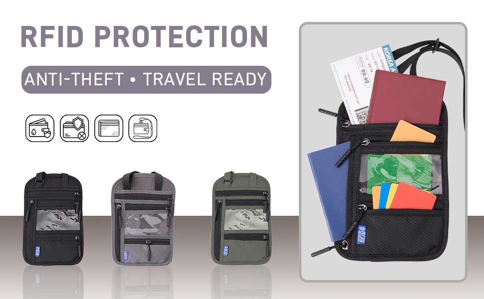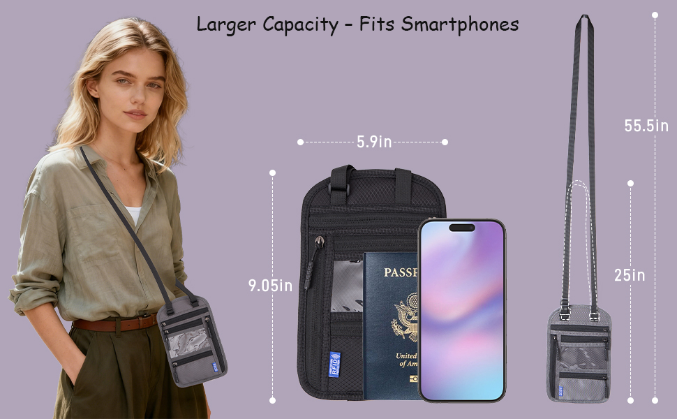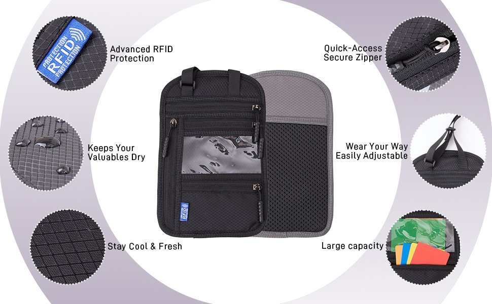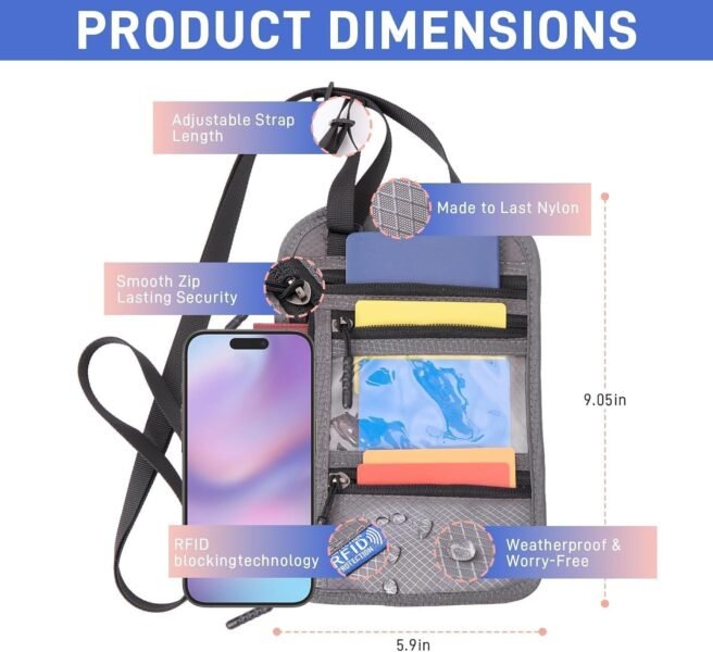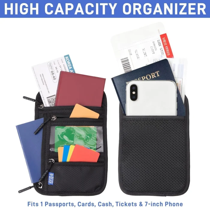 SPACIOUS ORGANIZATION – FITS PHONE & PASSPORTS: Designed for modern travelers, this large RFID passport holder keeps smartphones, passports, boarding passes, cards, and cash neatly organized in one secure travel wallet.RFID BLOCKING PROTECTION: Built with advanced RFID blocking layers, this passport holder helps protect your passport, credit cards, and IDs from unauthorized scanning while traveling through airports, public transportation, or crowded tourist areas.WATER-RESISTANT & DURABLE MATERIAL: Made from tough ripstop nylon with water-resistant coating, this travel neck wallet helps protect passports, phones, and documents from rain, splashes, and everyday travel wear.ADJUSTABLE & COMFORTABLE NECK STRAP The adjustable strap allows this neck wallet for travel to be worn comfortably under clothing for discreet protection while moving through airports, markets, and busy streets.SMOOTH & RELIABLE ZIPPERS High-quality zippers provide quick and smooth access to your travel essentials while maintaining durability for frequent trips and everyday use.SPACIOUS TRAVEL WALLET ORGANIZER Designed with multiple compartments to store passports, credit cards, cash, boarding passes, and even smartphones, keeping everything organized in one secure travel pouch.