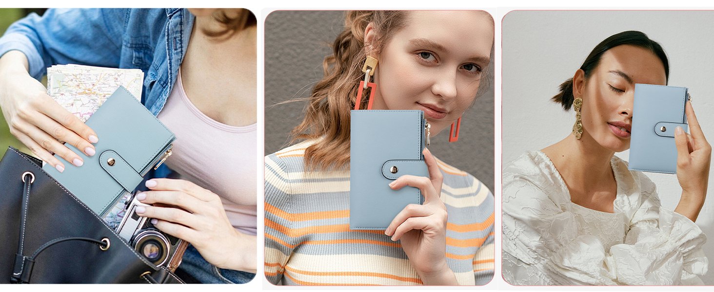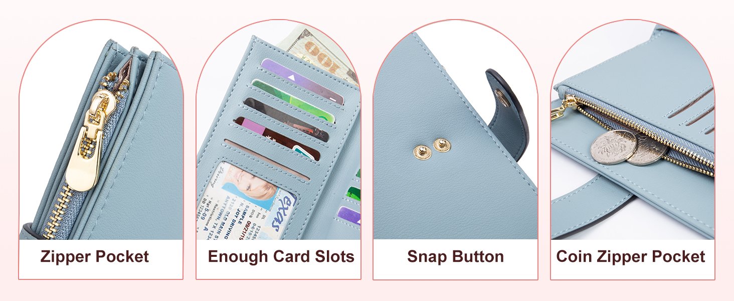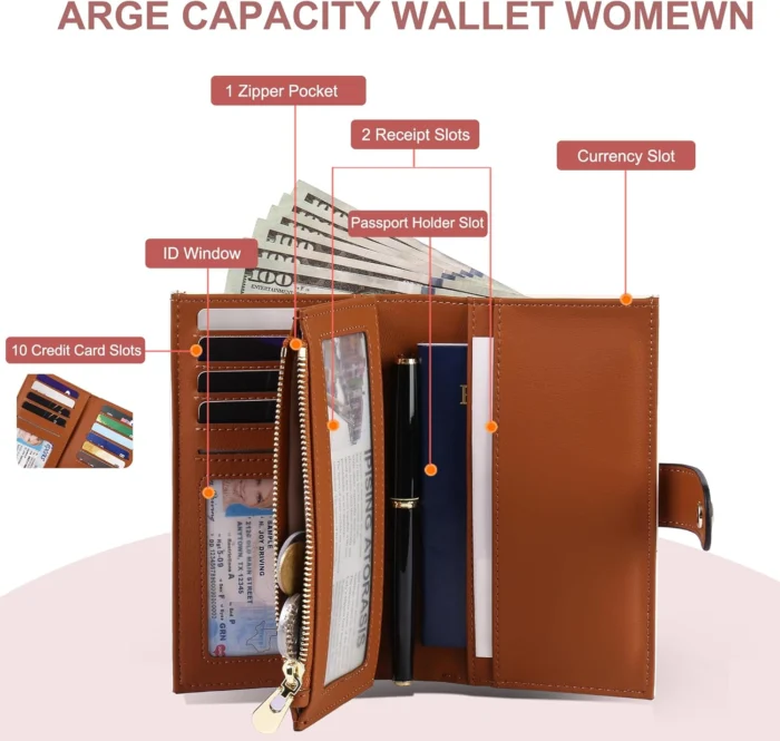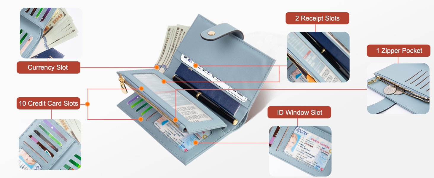 Large Capacity Womens Wallet: With 10 RFID-block credit card slots, 1 ID window, 1 zipper pocket for the coin and keys, 3 full-length compartments for receipts, 1 passport compartment, 1 pen holder and 1 deep cash slot, this medium size wallet for women can meet all your daily demands.