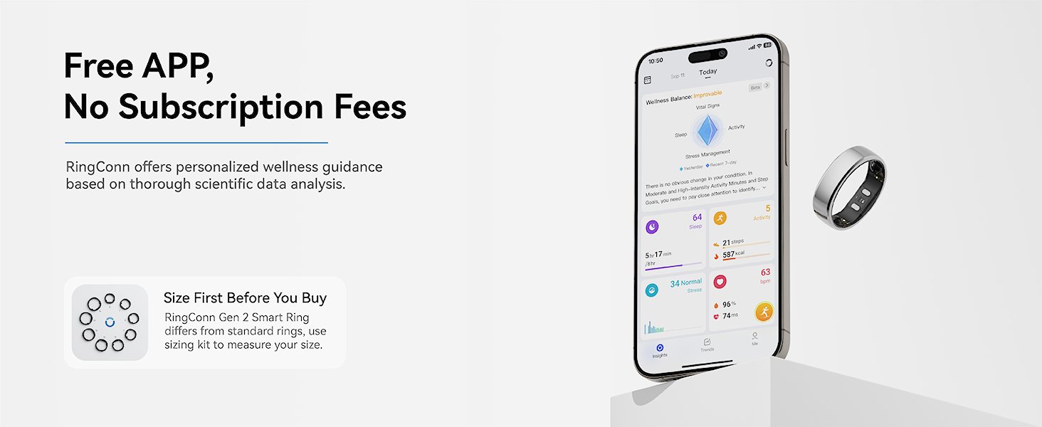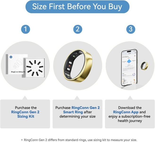 [Sleep Apnea Monitoring] RingConn Gen 2 Smart Ring supports sleep health with advanced technology. Developed with leading universities and hospitals, this AI-powered ring accurately tracks sleep apnea. Unlike traditional devices, it’s lightweight and comfortable, offering multi-day monitoring with real-time AHI data and personalized insights via a dedicated app for easy sleep health management [Size Before You Buy] RingConn Gen 2 Smart Ring uses unique sizing standards, different from U.S. and other health rings. RingConn Gen 2 Sizing Kit helps you find the most comfortable and accurate fit for your finger, preventing the inconvenience of returns and exchanges by ensuring you select the correct size before purchasing [No Subscription Fees] Unlock lifetime access to the comprehensive suite of features on the RingConn Smart Health Monitoring App with your RingConn Gen 2 Smart Ring. Experience continuous, real-time health tracking and personalized insights [More Than Just Health Monitoring] RingConn Gen 2 Smart Ring surpasses standard health monitoring features by not only tracking your activity, sleep, stress, heart rate, HRV, and blood oxygen saturation but also supporting OTA updates. This ensures continuous improvements and the addition of new features, delivering an ever-evolving experience tailored to your needs [Waterproof for Every Adventure] RingConn Gen 2 Smart Ring features upgraded water resistance of up to 100m, making it perfect for daily wear, workouts, and swimming. Plus, RingConn Gen 2 offers outstanding durability with a gentle touch, even for sensitive skin %$#