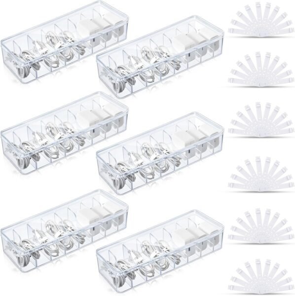Tatuo 6 Pcs Cable Organizer Box with Wire Ties, Plastic Cord Storage Box with Lid, Electronics Organizer for Home Office Desk Organizers and Accessories (Clear)