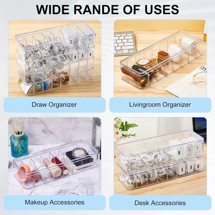 Reviewer: Molly B. Rating: 5.0 out of 5 stars Title: Sleek charger organizer — perfect clutter buster ⚡️ Review: This clear acrylic charger organizer is exactly what my desk needed—it keeps all my cables, phone charger, and earbuds neatly in one place without looking bulky. The transparent design means everything is visible and easy to grab, and the compartments are sized just right for everyday essentials.It’s sturdy, doesn’t tip over when grabbing a cord, and cleans easily if it gets dusty. No more digging through piles of chargers on the side table!Pro tip: put it by your charging station or nightstand to keep tech clutter under control. Simple, functional, and stylish—highly recommend for anyone tired of tangled cables. Reviewer: Logan Rating: 5.0 out of 5 stars Title: Love Review: Love this so much for organizing my cords and cubes – have so many so getting the two boxes really made a difference. The ties are great and work well as they’re adjustable. Would purchase again Reviewer: J. B. Rating: 4.0 out of 5 stars Title: Cable organizer…Yes, but with a caveat Review: We have a drawer in the kitchen that had all of our charging cords in it. It was a rat’s nest. I thought that these might be the solution. They were…Sort of.The drawer in question was a standard sized drawer (18 1/2 inches long by 12 1/2 inches wide and 3 inches deep). I was able to fit five of these organizers into the space.Each organizer has enough dividers to be able to be divided into 8 smaller compartments. The dividers are included and are removable. The dividers DO NOT go all the way to the top to seal against the lid (See the image). I knew that going into this and it wasn’t an issue for me, but if you are buying these to store small parts that might get jostled, they will most likely not stay in their original compartment. There were also 10 silicone cable ties included with each organizer as well as a lid that fits securely into the top of the organizer. The lid has a lip on top that allows the organizers to be stacked without slipping off of each other. With the lid on, the organizers are 2 3/8 inches tall. Without the lid, they are 2 inches tall.As far as holding cables, I think that each of the individual compartments are too small to hold a cable unless it is wrapped really tight (Which could damage the cable). As you can see in the image, I ended up using two or three compartments for multiple similar cables. In my instance, using the lids was an annoyance because I would have to pull the whole organizer out of the drawer to remove the lid. The lid is a tight fit and is very smooth which might be an problem for people with hand mobility issues. I chose not to use the lids. I now have a stack of lids with no use for them.The cable ties are great and seem strong. The only problem I had with them is that they are slick and trying to get them over a larger cable plug was complete chore. Not impossible but still a chore.If I could do this over again, I’d probably look for an organizer that was a little bit taller and wide enough to completely fit my drawer. I’m not faulting these. The lack of planning and measuring, is on me.If these fit your bill, they are worth it. The plastic is thick and not flimsy at all. If anything changes at my end, I’ll update this review. Reviewer: Sarah Waggoner Rating: 5.0 out of 5 stars Title: Simple, practical. Buy now! Review: This cord organizing box has been a game changer in our house. All of our cords are neatly organized and easy to find, and the best bonus is that my kids have stopped stealing mine because they can finally find what they need on their own. Simple, practical, and totally worth it! Reviewer: Tink Rating: 5.0 out of 5 stars Title: Get these boxes!! Review: Overall very pleased with these boxes. The slots are just a tad too small for a lot of our cords, but since the dividers are customizable it’s okay. And because the dividers are customizable I’m able to keep certain things together, like charging bricks and their cords, or a battery pack with its charging cord. They stack very nicely too! The silicone ties are horrible, not easy to use at all, and very bulky. I bought a pack of Velcro ties instead and these are much better. Very happy with this purchase!! Reviewer: Amazon Customer Rating: 5.0 out of 5 stars Title: Cable Organizers Review: I wish I would have gotten this sooner! We had a drawer just full of needed cables and this little gadget has works amazingly.*Great quality*Easy to stack*Fits perfectly in the drawer Reviewer: klinere Rating: 3.0 out of 5 stars Title: Not for large cords Review: The product is a good quality with lids, ties and separators. However, in looking at the photo and other reviews, I can’t see how you get more than three or four cords In the storage box. As noted in a review below , today’s cords are much longer and do not fit in one divided section. I was only able to use about three dividers, having to put the cords in lengthways. . Reviewer: paravig Rating: 5.0 out of 5 stars Title: Perfect cord organizers! Review: Absolute perfect cord organizers! I looked into several different options, and I am so pleased with how these turned out. You can customize them perfectly, they are extremely sturdy. They fit in my drawers great, and they hold a ton! Reviewer: Lumos Rating: 3.0 out of 5 stars Title: Review: It does exactly as advertised. The only downside is that the lid is difficult to open. Reviewer: Katie_Al Rating: 4.0 out of 5 stars Title: Review: Love the product but the lids aren’t easy to get off…you have to use your nails if you have them! Reviewer: rafael Rating: 5.0 out of 5 stars Title: Review: Produto de ótima qualidade e de bom acabamento