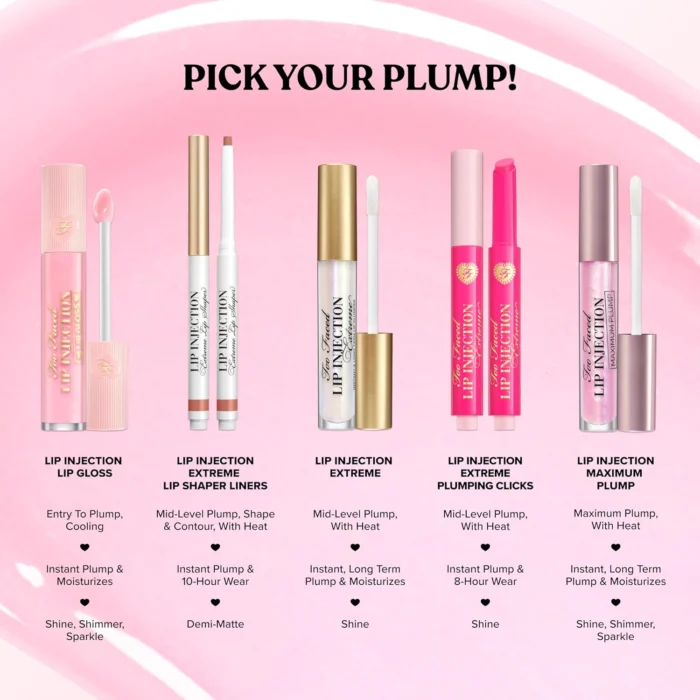 Add to Cart Add to Cart Add to Cart Add to Cart Add to Cart Customer Reviews 4.0 out of 5 stars 8,155 4.3 out of 5 stars 593 4.0 out of 5 stars 149 4.3 out of 5 stars 477 4.1 out of 5 stars 3,698 Price $33.00$33.00 $28.00$28.00 $23.80$23.80 $24.00$24.00 $33.00$33.00 Plump Level Mid-Level Entry Mid-Level Mid-Level Maximum Benefits Moisturizes Moisturizes 8-Hour Wear 10-Hour Wear Moisturizes Performance Instant & Long Term Plump Instant Plump Instant Plump Instant Plump Instant & Long Term Plump Form Liquid Gloss Liquid Gloss Click-Up Gloss Stick Click-Up Lip Liner Pencil Liquid Gloss Finish Shine Shine, Shimmer, Sparkle Shine Demi-Matte Shine, Shimmer, Sparkle Cruelty Free ✔ ✔ ✔ ✔ ✔Can I Use The Lip Injection Extreme Lip Plumper Product With Other Lip Products?