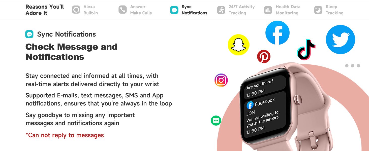 [Stay connected on-the-go] Simplify your daily routine by managing your calls and messages in one place. With Bluetooth compatibility, the TOOBUR smartwatch allows you to make and receive phone calls, you can also receive social media, E-mail and SMS notification right on your wrist, you will never miss an important message or notification. keeping you connected while you’re on-the-go.Please note that this product cannot reply to messages!