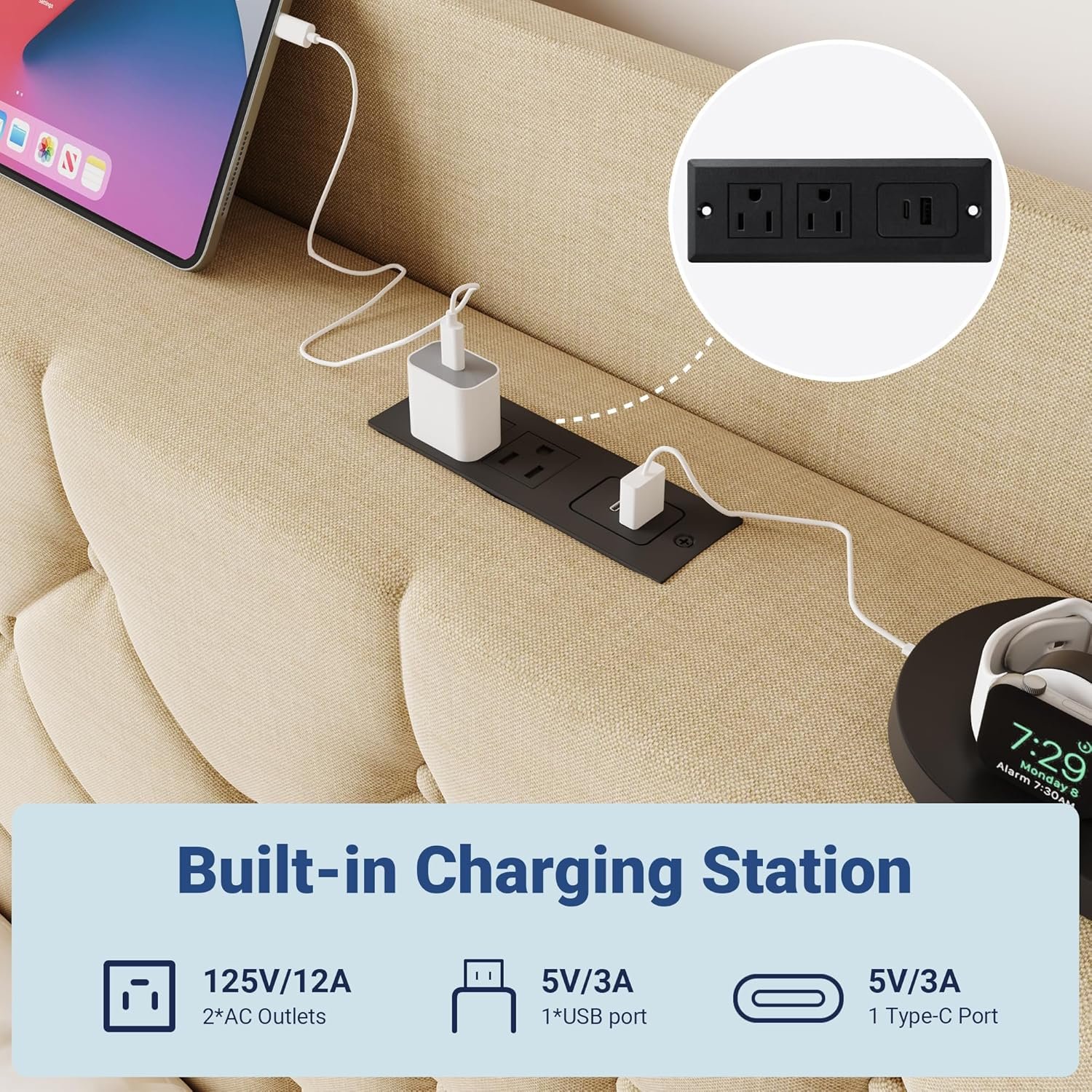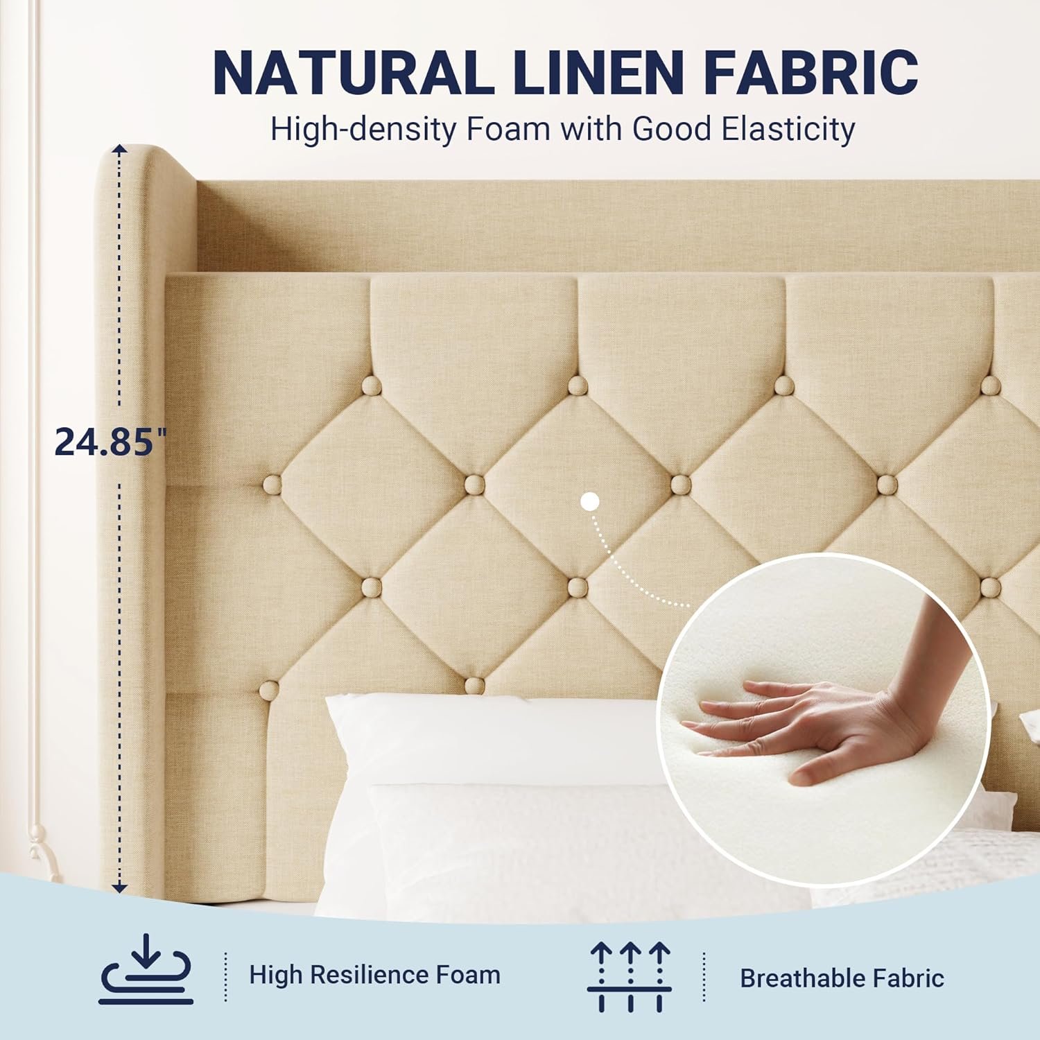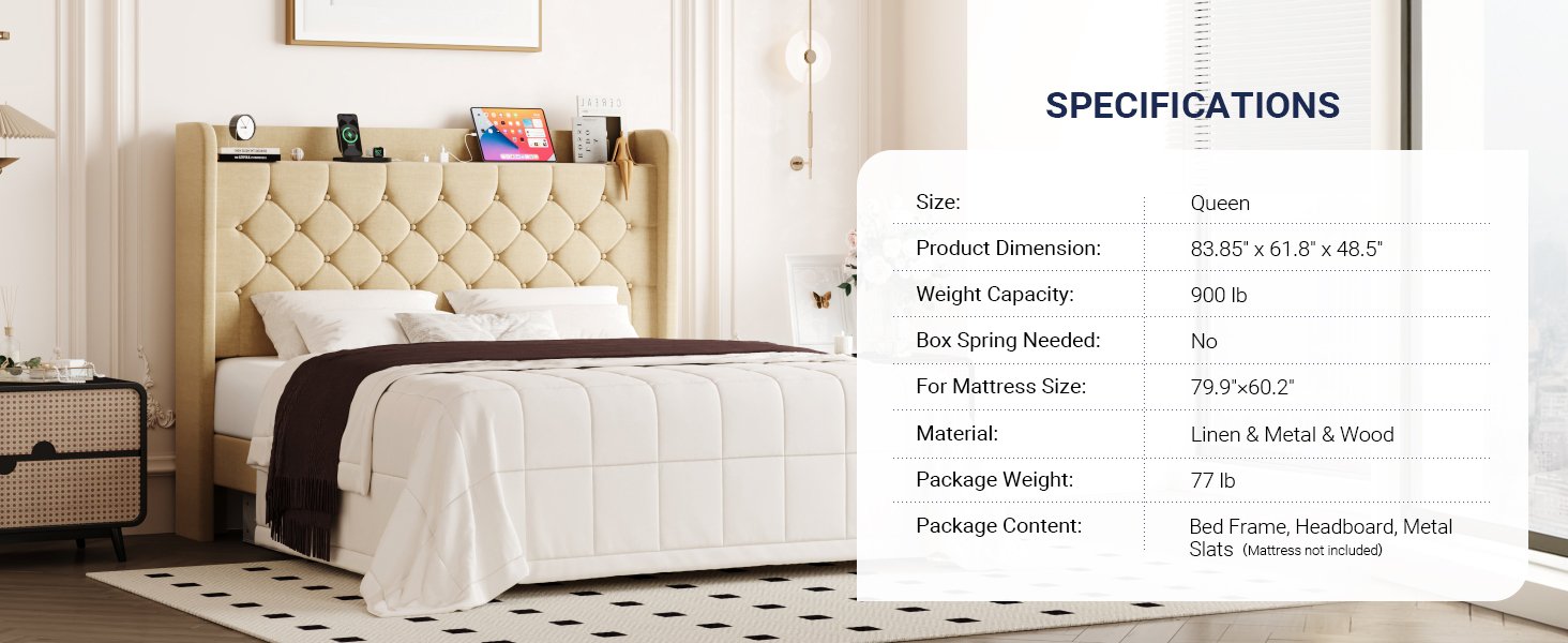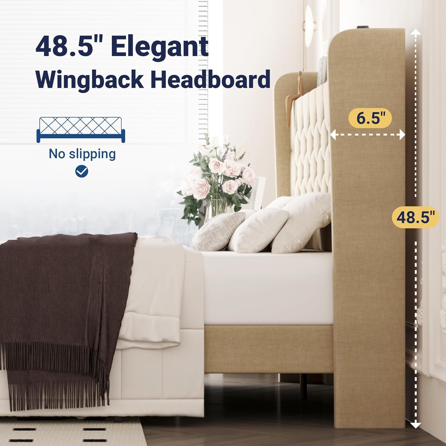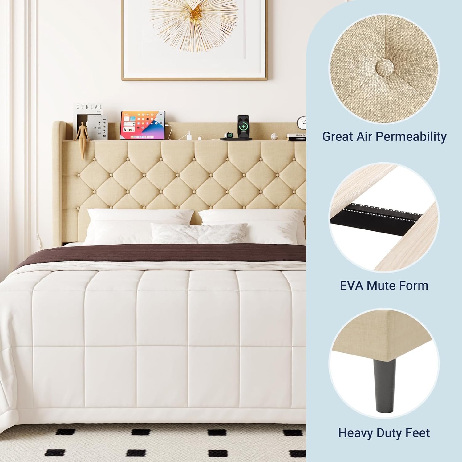 Allewie Queen Size Bed Frame, Storage Headboard with Charging Station, Wingback Linen Upholstered, Diamond Stitched Button Tufted, Sturdy Wooden Slats, No Box Spring Needed, Easy Assembly, Beige