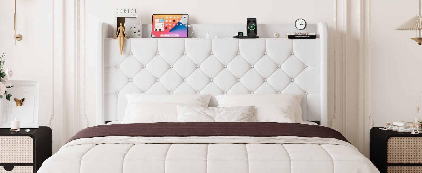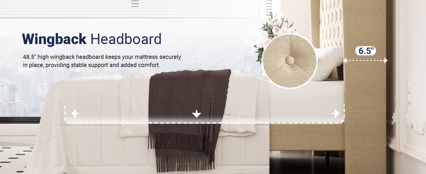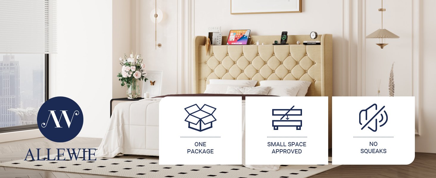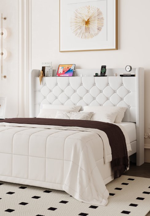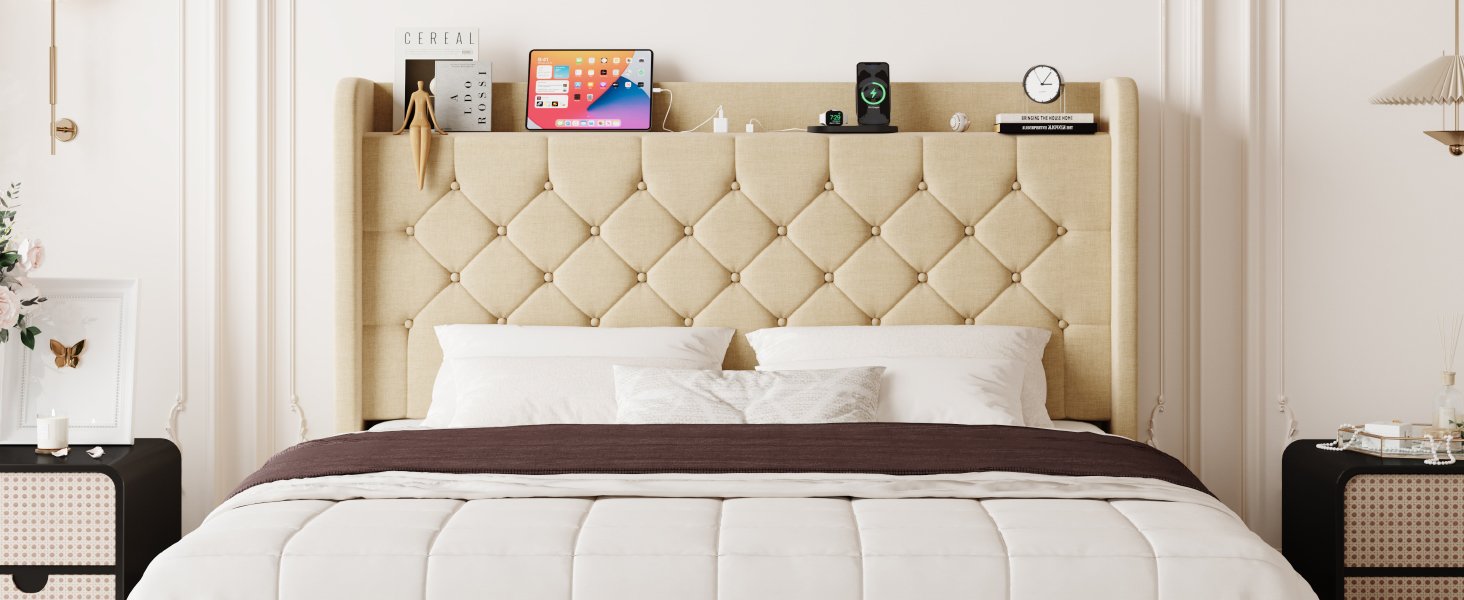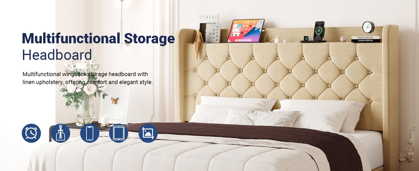 Allewie Queen Size Bed Frame, Storage Headboard with Charging Station, Wingback Linen Upholstered, Diamond Stitched Button Tufted, Sturdy Wooden Slats, No Box Spring Needed, Easy Assembly, Beige