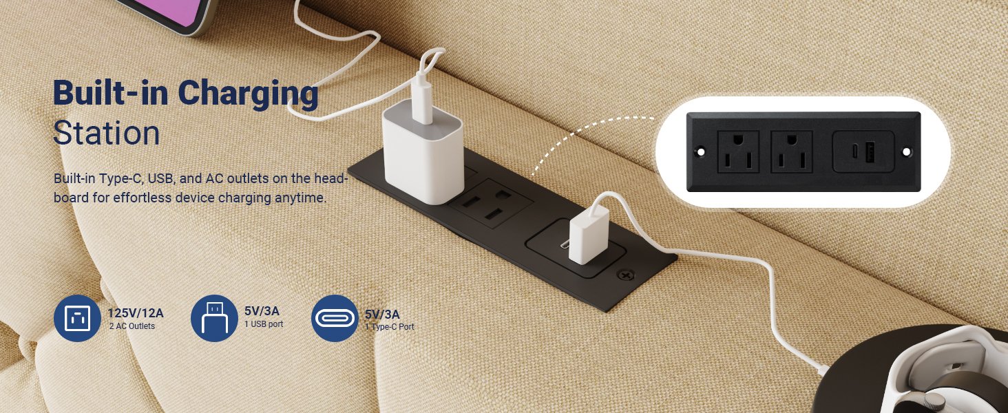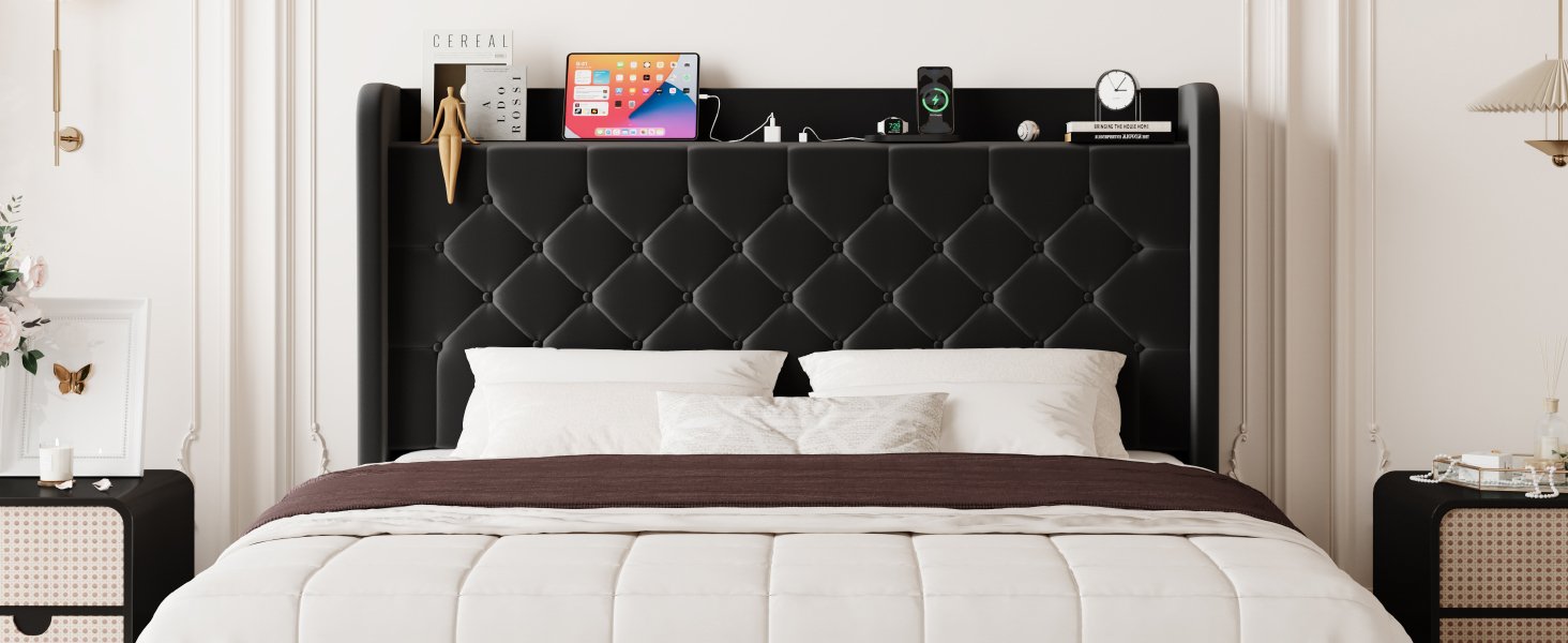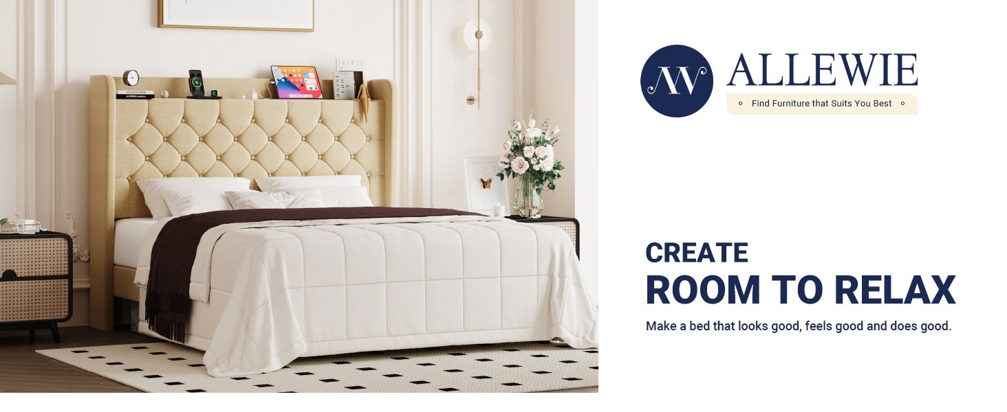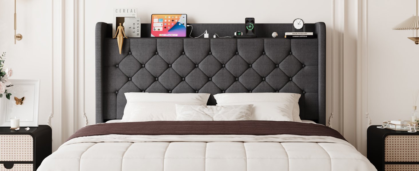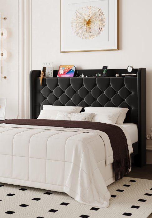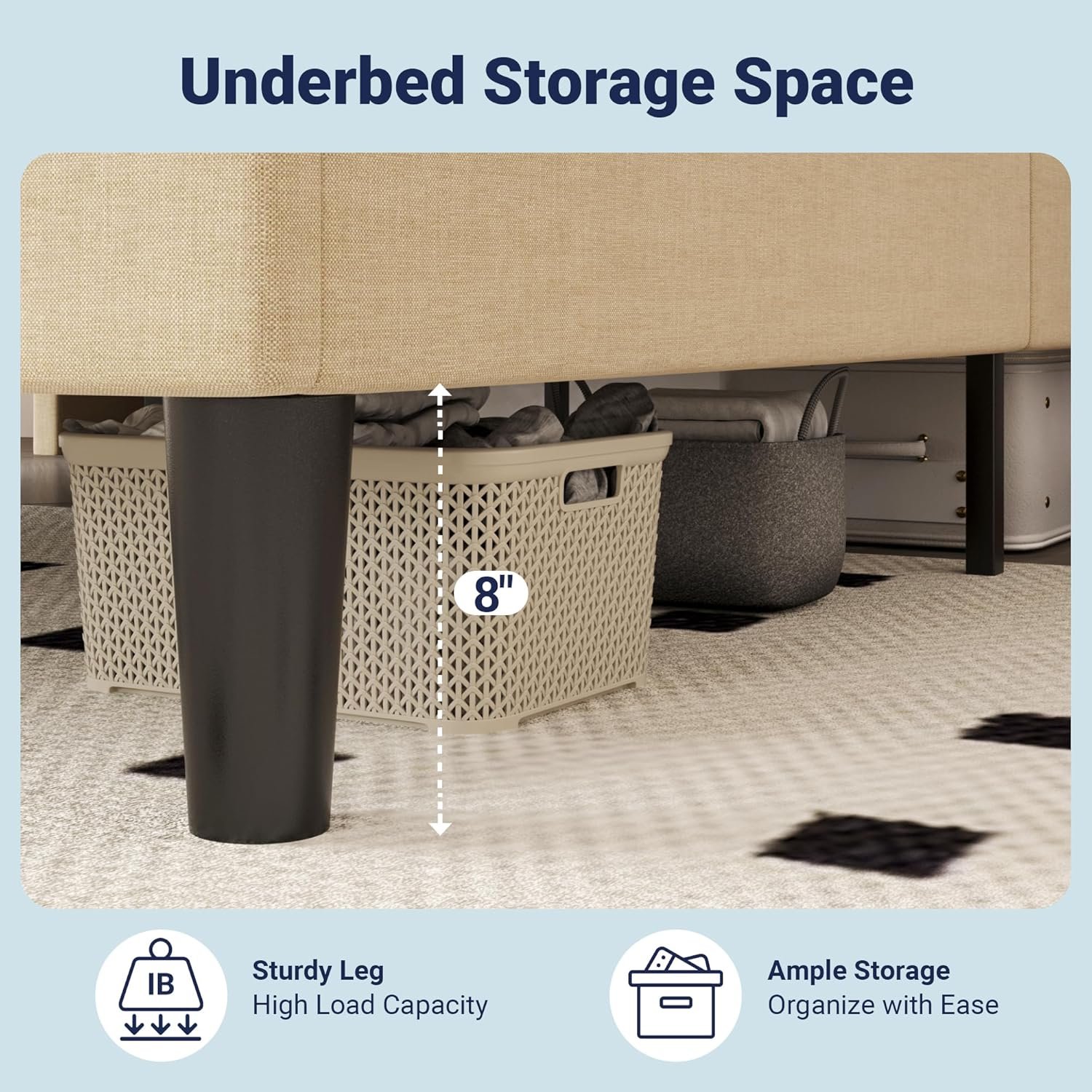 Allewie Queen Size Bed Frame, Storage Headboard with Charging Station, Wingback Linen Upholstered, Diamond Stitched Button Tufted, Sturdy Wooden Slats, No Box Spring Needed, Easy Assembly, Beige